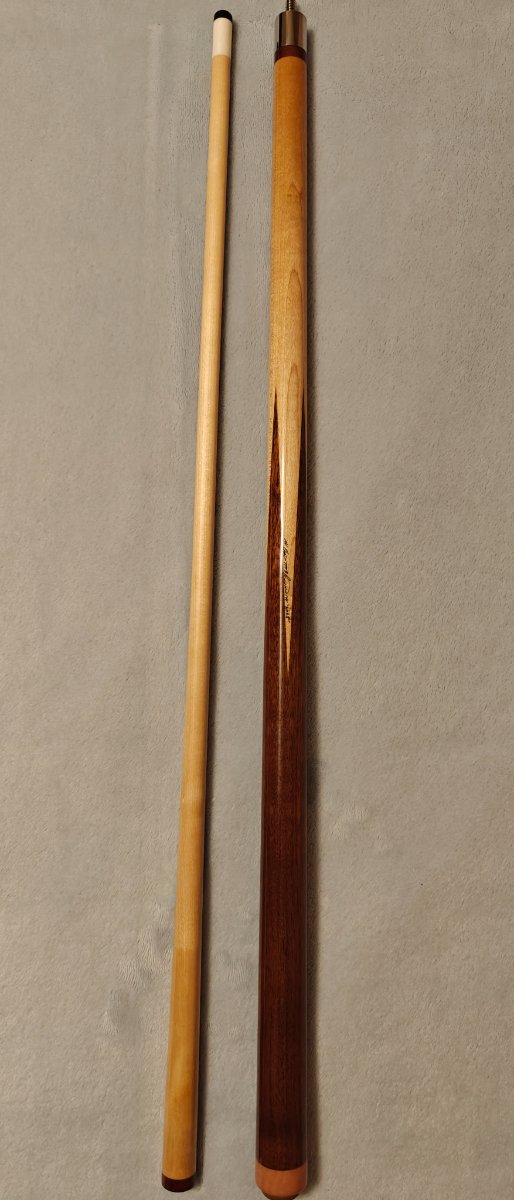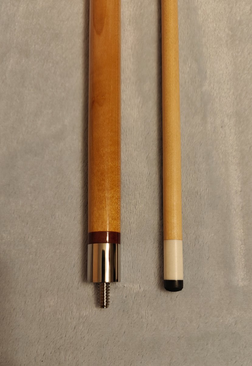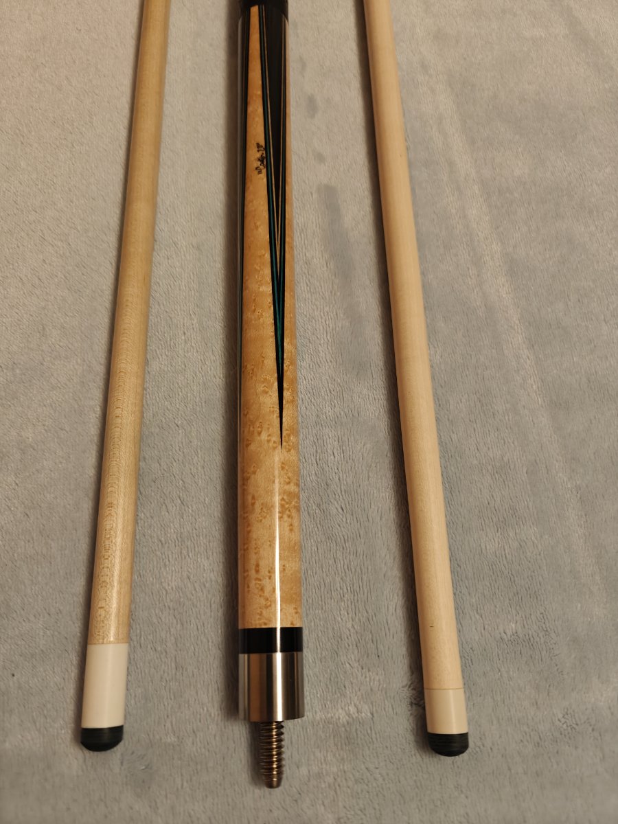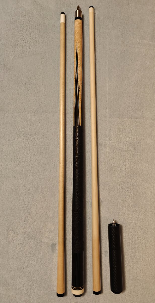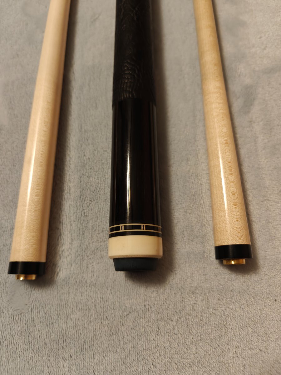 4 point ebony into birdseye maple with veneers. Forearm has been refinished, new Spanish Bull Leather wrap and shaft added. New ultraskin medium tips installed on both shafts. Comes with joint protectors and 6 inch carbon extension. 5/16 x 14 pin, joint is phenolic with a stainless steel sleeve.