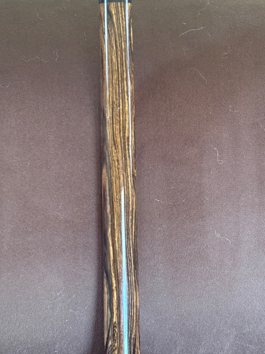 The other butt is made of figured bocote in the forearm and sleeve. The wrap area is Indian rosewood. Has brass rings and lines. Black block inlays. Radial pin. Joint size is .850. The weight is 19oz( heavy) price is $250 firm