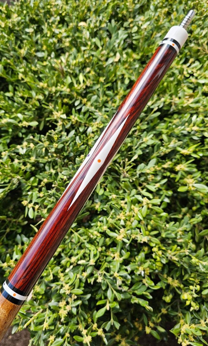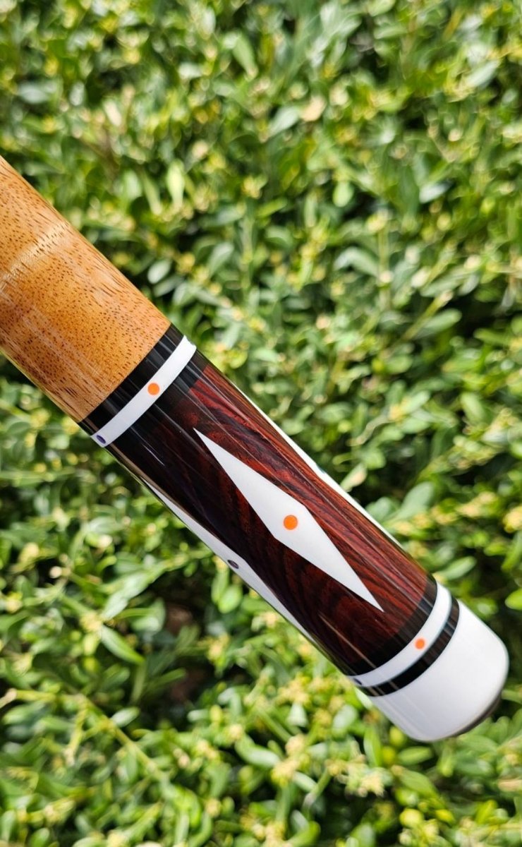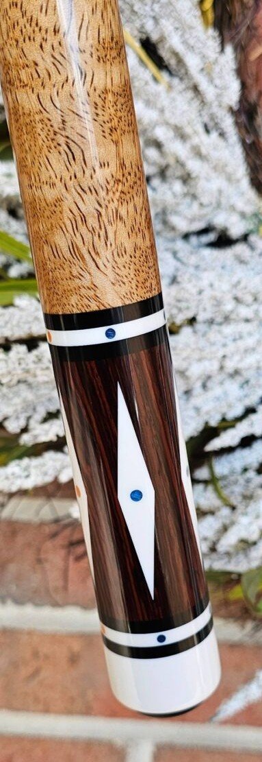 For Sale- Very unique Nitti. Signed. Mint condition. Mexican Cocobolo forearm, Lacewood segmented handle. 5 colored dot inlays, at 8 locations. Large diamond inlays in forearm and butt. Radial pin.