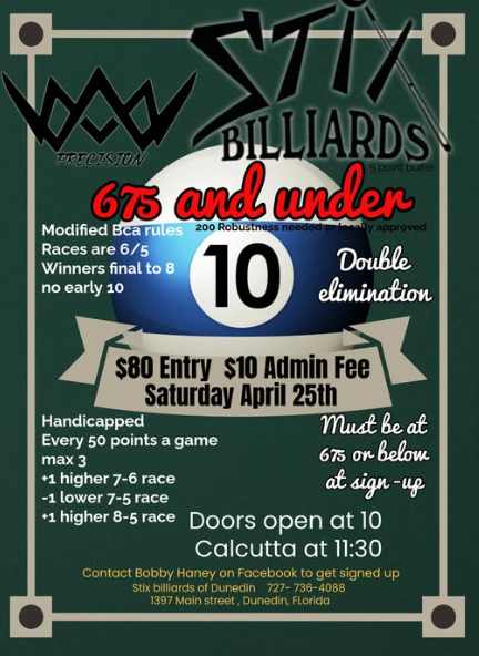 I'm 67 and played in a 610 and under 10 ball 180 miles away from home last year. Full field of 48 and I headed home after losing the point match at 8 pm. There were about 4 matches backed up on the losers side. All the kids there couldn't believe I was quitting but after 11 hours a man's got to know his limits. Probably would have waited until 1 am and got third place anywayCould be worse. You could be 67 and 560...