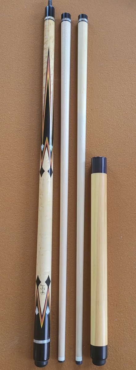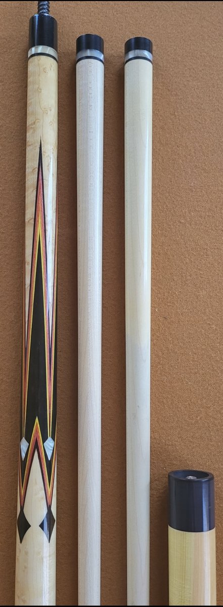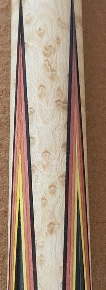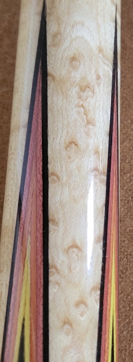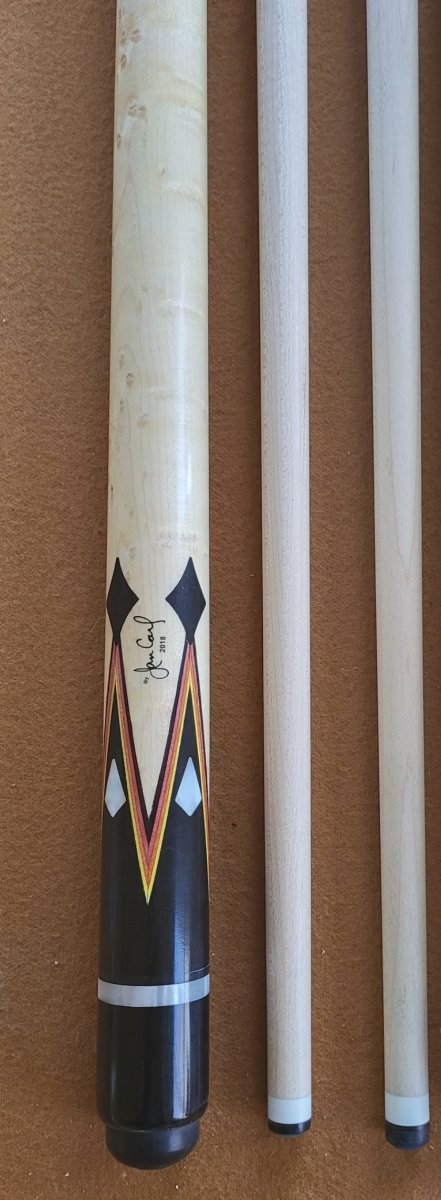 Jan Carl made this from a Davis blank. A real show stopper here. Gorgeous cue. 12 point Flame veneers.