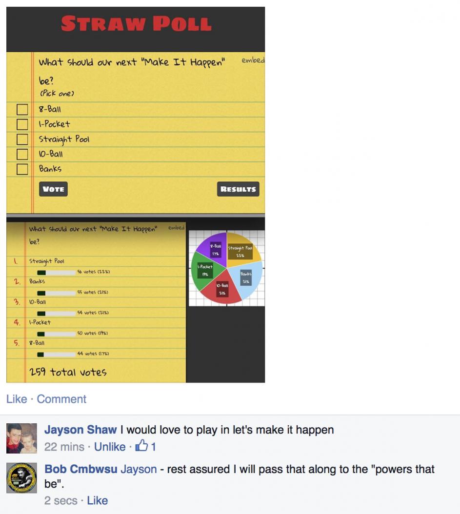 • Patrick Fleming and the crew at Accu-Stats (www.accu-stats.com) has done so much for the sport and wants to do even more by bringing you "Make-It-Happen" via live streams. In order to do that, they need "your" input. It's fast and simple. Just click on the link below, cast your vote and done!