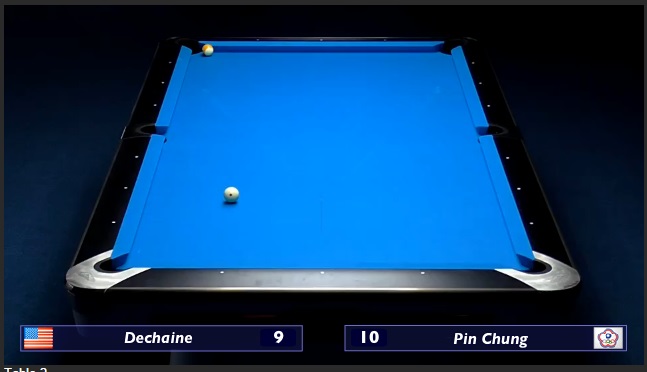 This is exactly what my screen looked like when it froze just a fraction of a second before that 9 missed the pocket. I knew the minute he hit it that it would catch the point at the very least, but I hoped for a fortuitous bobble. I was in limbo for several minutes before the stream came back and showed the 9 still sitting there... and the score now 11-9 in favor of Pin Chung. :(