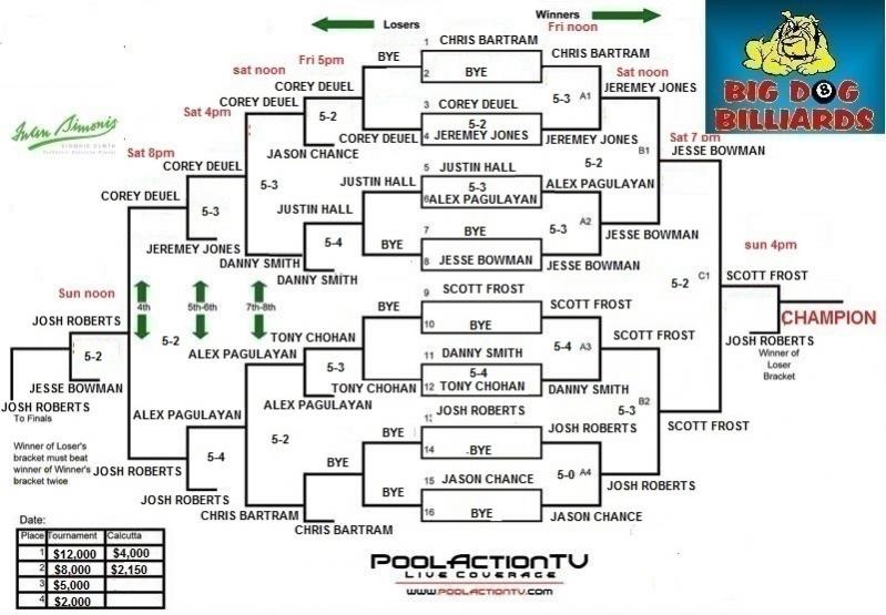 Josh Roberts vs Scott Frost in the finals at 4 pm central Josh must win two matches (true double elimination) Match will have special commentary by Jeremy Jones and Scott Rabon Get your pass @ www.poolactiontv.com