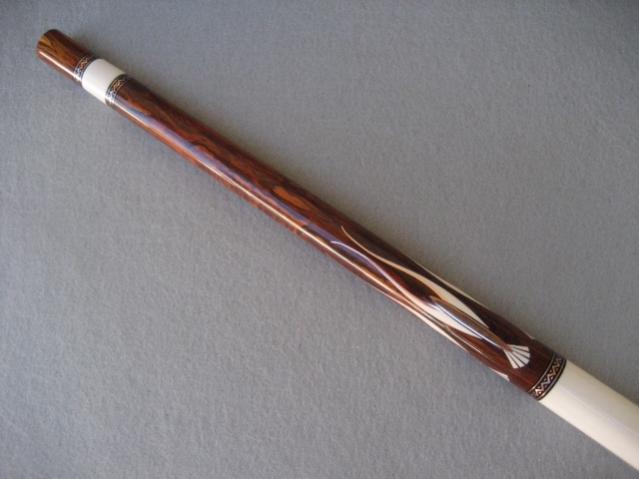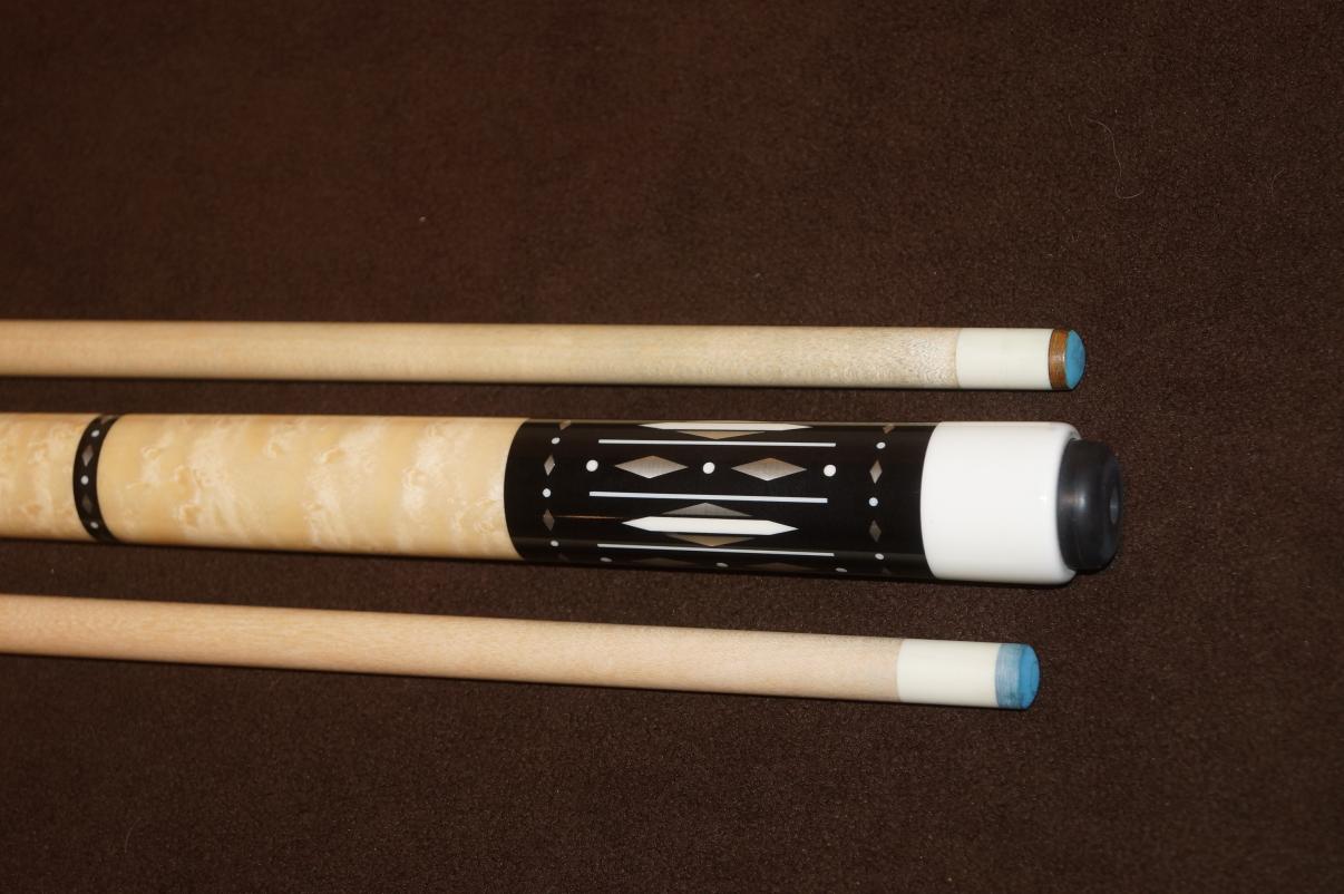 Beautiful work by true master.This is my prize posession, a 6 veneer Rauenzahn cue full-spliced MONSTER with sharp points both ways!!!! from 2013 (<: