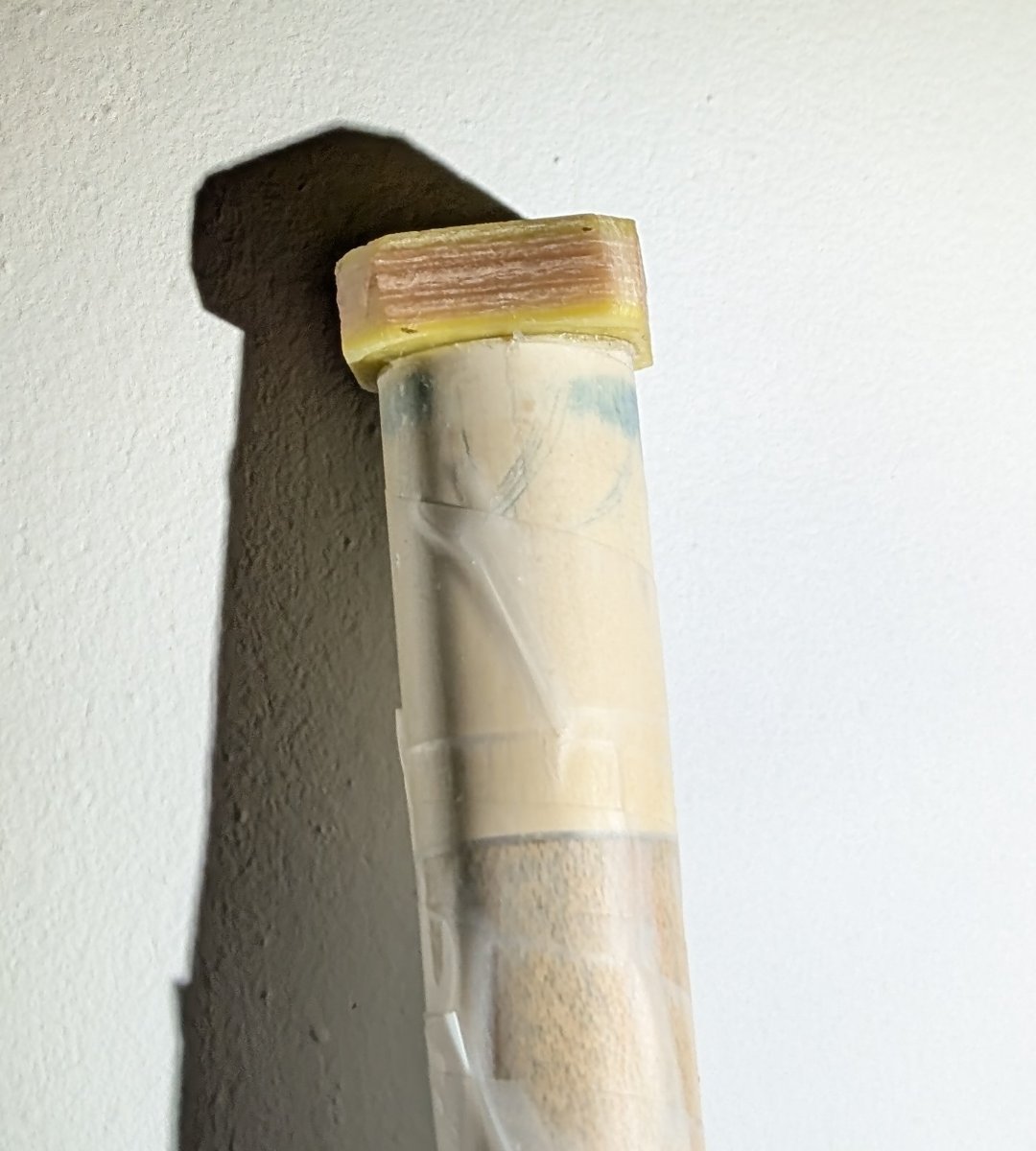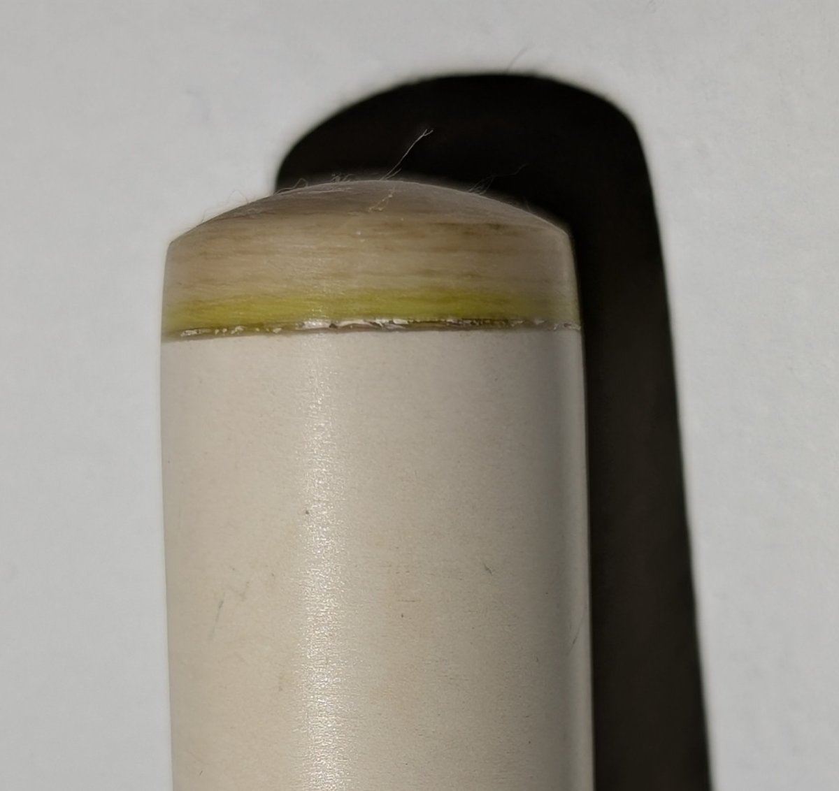 It has yellow top and bottom layers. Layers inside are white, brown, and reddish brown. Shaping the tip exposed the brown layers and polishing the tip made the surface show brown rings.