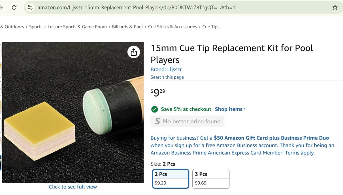 The company’s description is weird claiming it fits cues “perfectly”; its easy to install; that you could replace a cue tip during a game. It fairly enough claims the tip is small, light, easy to carry and store.