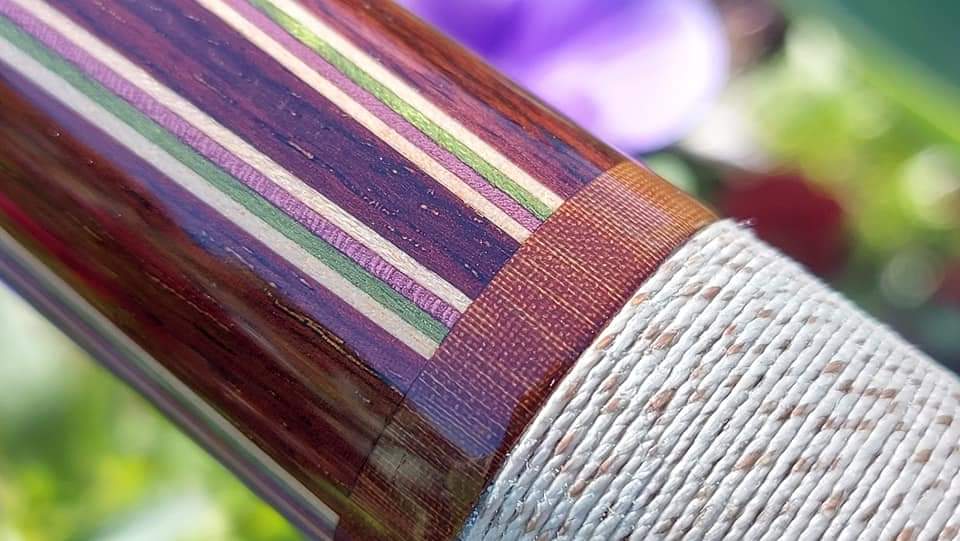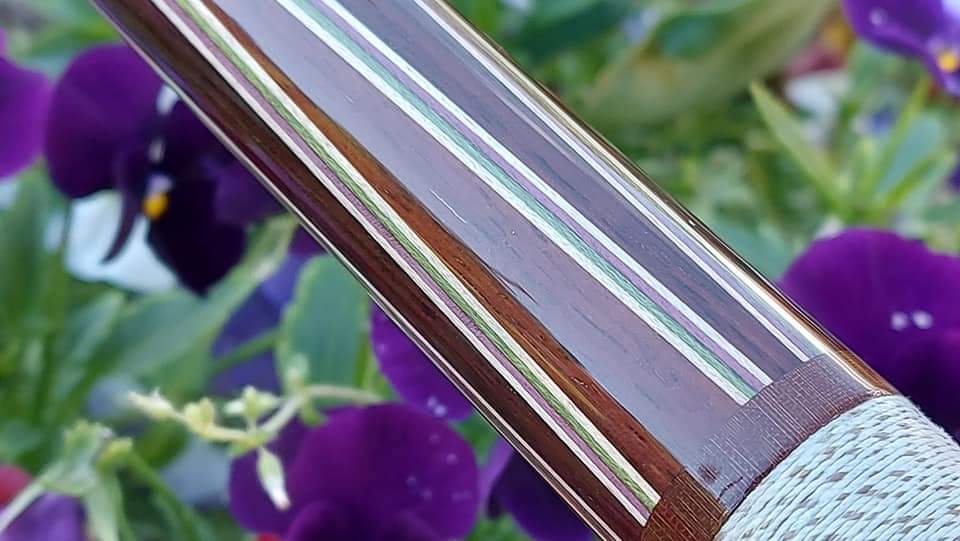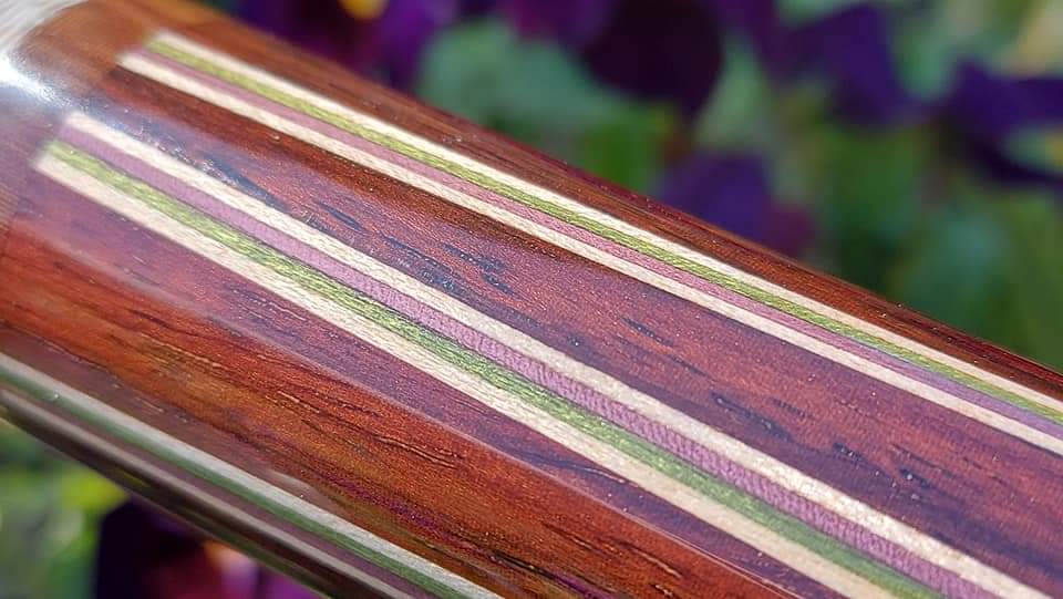 4 Points Rosewood into darker highly figured Rosewood with a beautiful combo of natural, lime green, lavender purple and natural veneers.