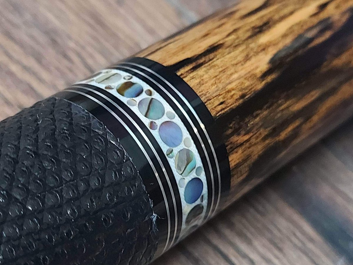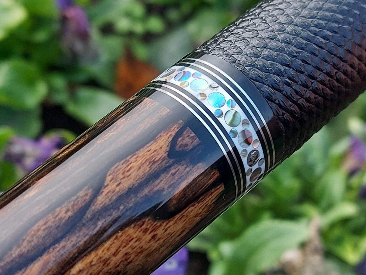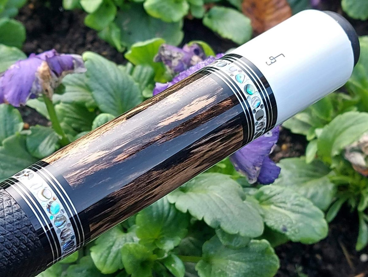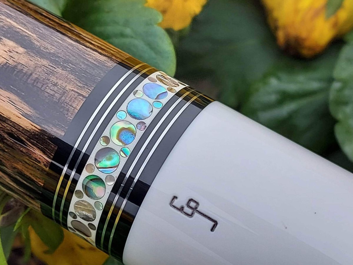This is a very typical example of Ed Prewitt's work, who is known for his super-fancy ringwork. Almost all of his cues display his traditional rings containing very fancy small dots of naturally iridescent Paua Shell (Paua Shell is a natural product native to New Zealand.) They are very striking and add a lot to any cue.