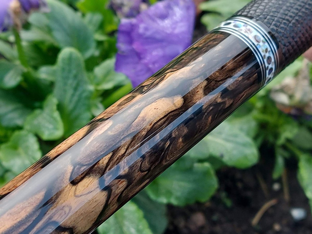 Black White Ebony, beautiful lizard leather wrap perfectly installed, 3/8x10 pin, Pau Shell the highest level dots rings on all location, custom built joint protectors with Pau Shell dots.
