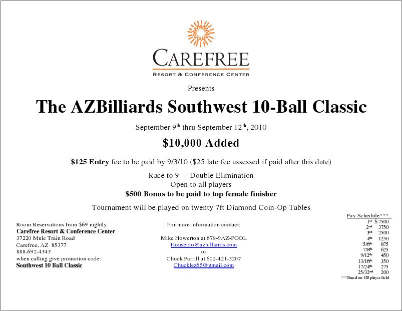 The Carefree Resort and Conference Center presents the AzBilliards Southwest 10-Ball Classic.