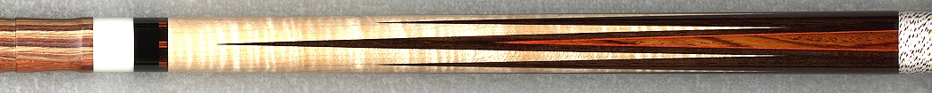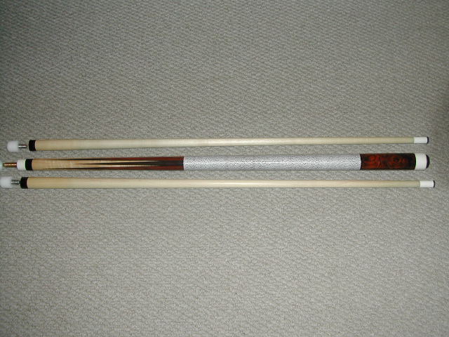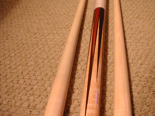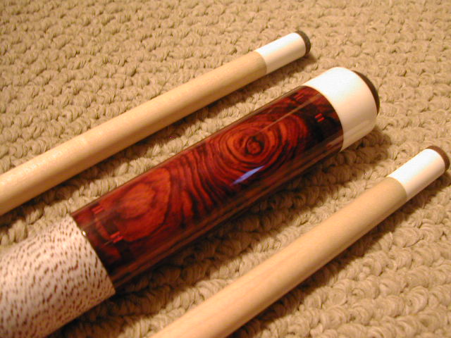 The cue was for sale above. I got the cue directly from Darren at his shop. SPeaking of his shop that guy has his sh@# together. WOWOWOW!! What a great cue builder!!! This cue has 8 points of East Indian Rosewood, 4 hi 4 lo. The hi points have Cocobola points recut with a red veneer. All the ringwork is the same. The Cocoburl butt sleeve is very nice. Curly bm nose, Phenolic joint and Butt cap, Brass pin. Darren makes his own pins. White brown spec wrap, 19oz, 12.8mm shafts, Lepro tips, 2 hours of play. Brand new from 06. Very hard hit!! I have my own pics if needed. Trades, Cash.. $1050.00 OFFERS!!!!!!!! TRADES!!!!!!!