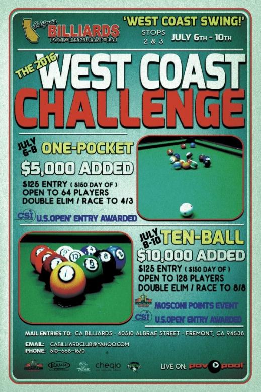 Sign-ups are now officially open. You can phone the pool room (510) 668-1670 or email us at cabilliardclub@yahoo.com. We Also have a great room rate with Double Tree By Hilton, Which is walking distance to the pool room. Tues and Wed are $99 per night and Thurs, Fri, and Sat night are $89 per night. Call them at 800-445-8667 and mention ca billiard rate.