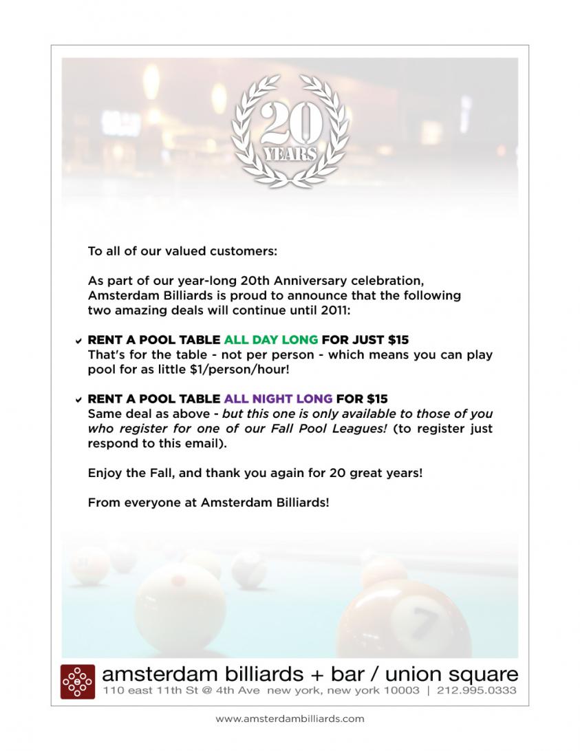 Amsterdam Billiards is now offering table time specials to celebrate their 20th Anniversary. Check out the flyer for more details!