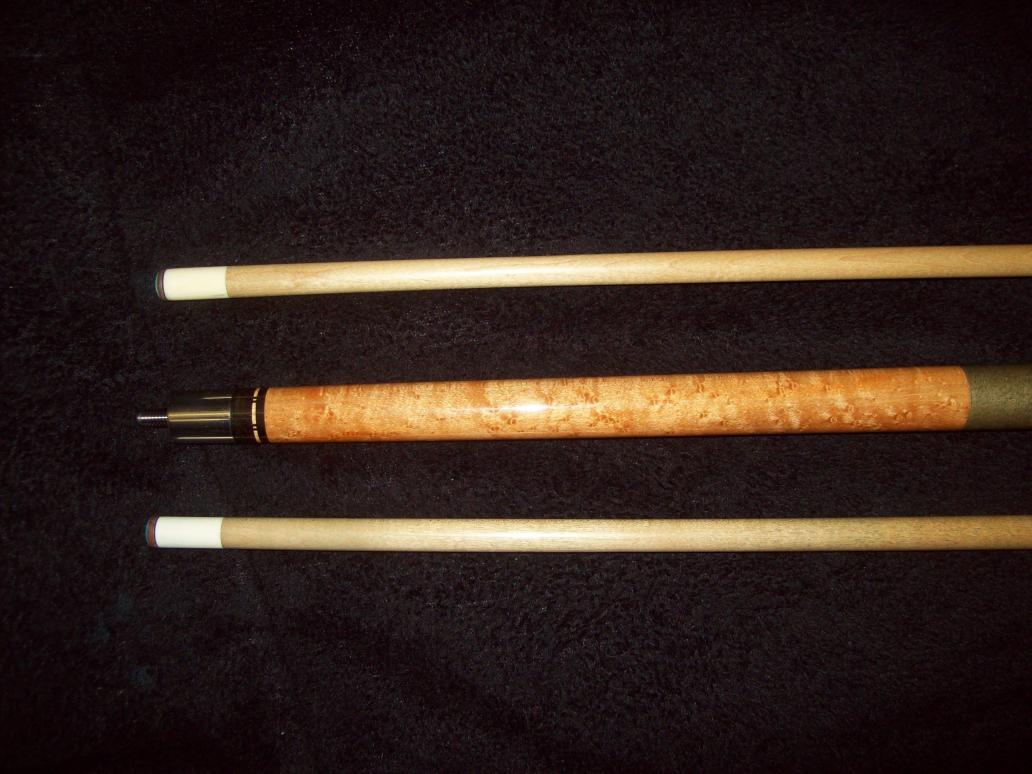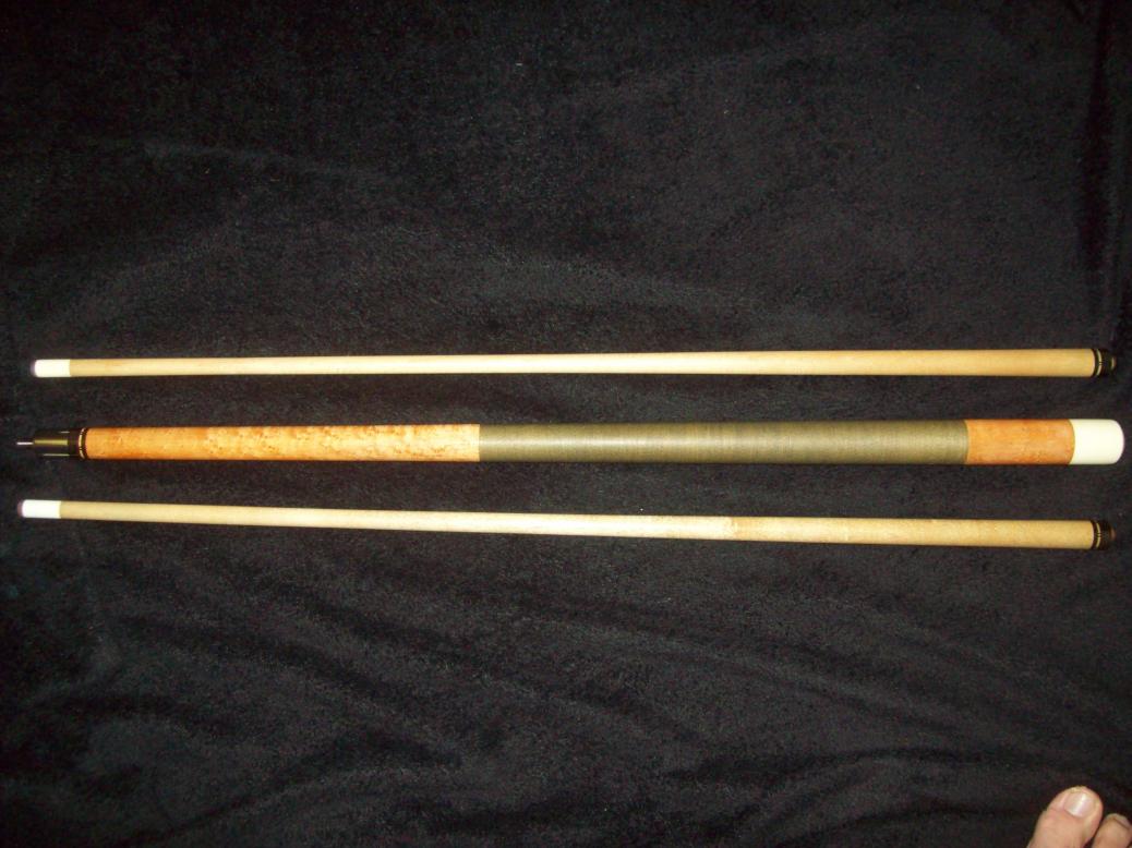 Nice shooter. This cue measures 60 1/2 inches from floor to tip. Comes with 2 shafts, both with ivory ferrules. One has what appears to be a hairline crack in is, as seen in the photos. That shaft has also been repaired from a ding, and is barely noticeable but to the most discriminate people. I have a signed letter from Richard Black acknowledging that he made this cue in 1977. I need to find the letter, and will post pics when I do. It was krinlked up from the previous owner, and I put it in a book somewhere to try to flatten it out.