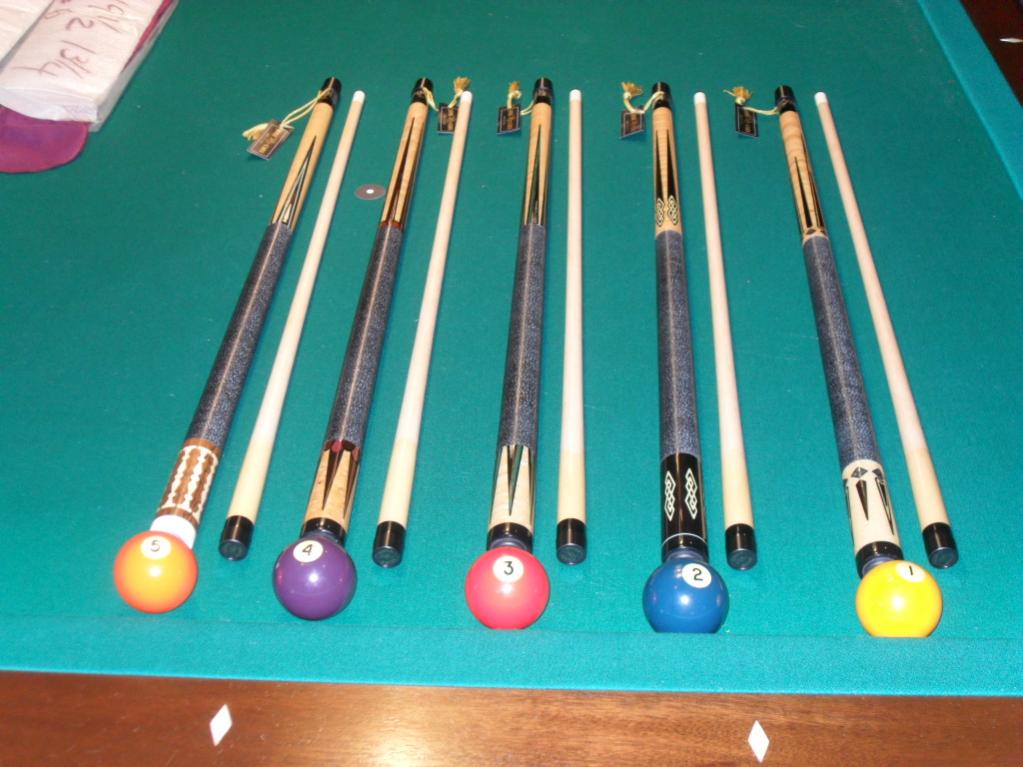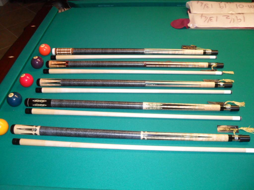 All Cues have 13 1/4" shafts and the same tapers. The cue designer and weight of each cue are below. Tough to get great pics. Not 1 of these cues has ever been chalked. All brand new.
