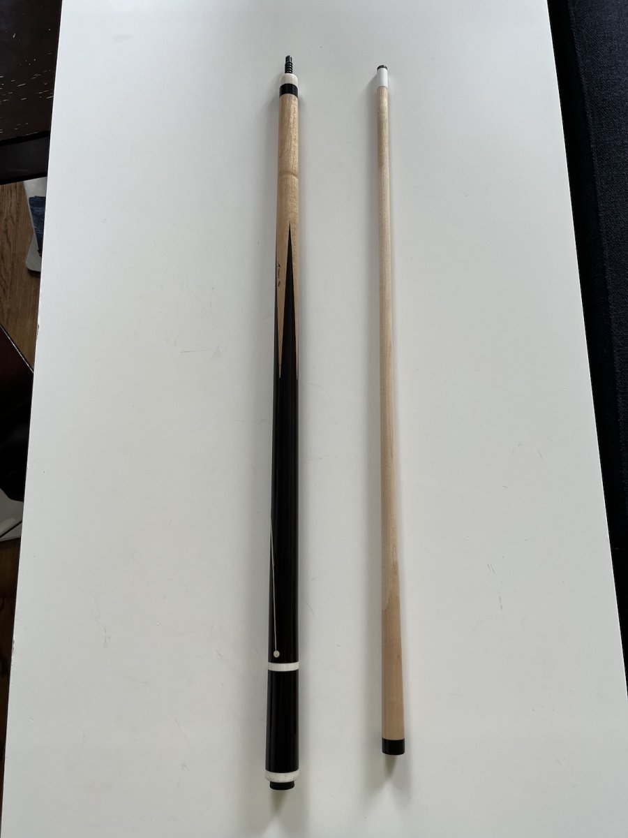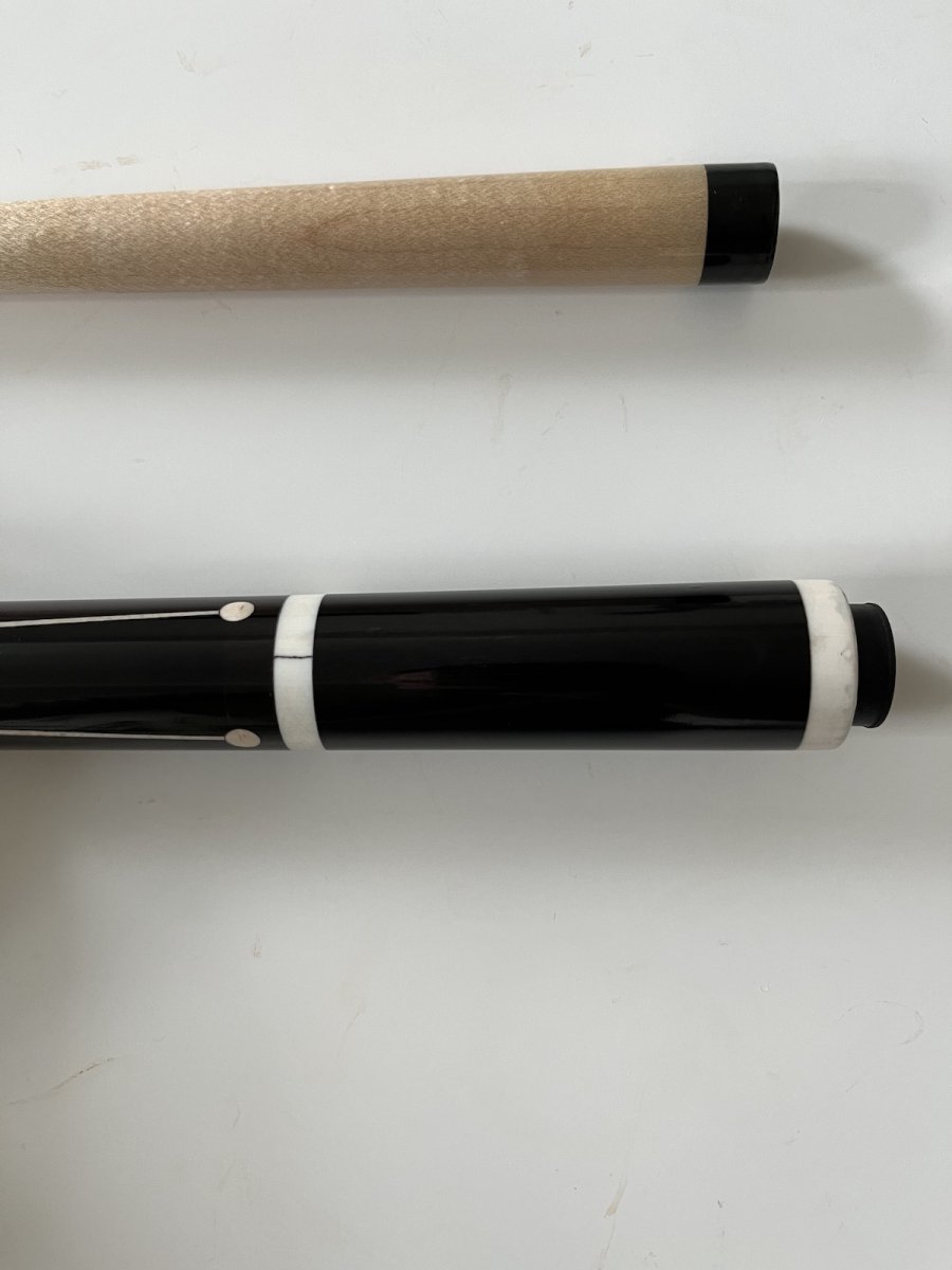 The hoppe ring has a visible crack. Otherwise, the cue is clean and in good used condition. Both shaft and butt roll nice and straight.