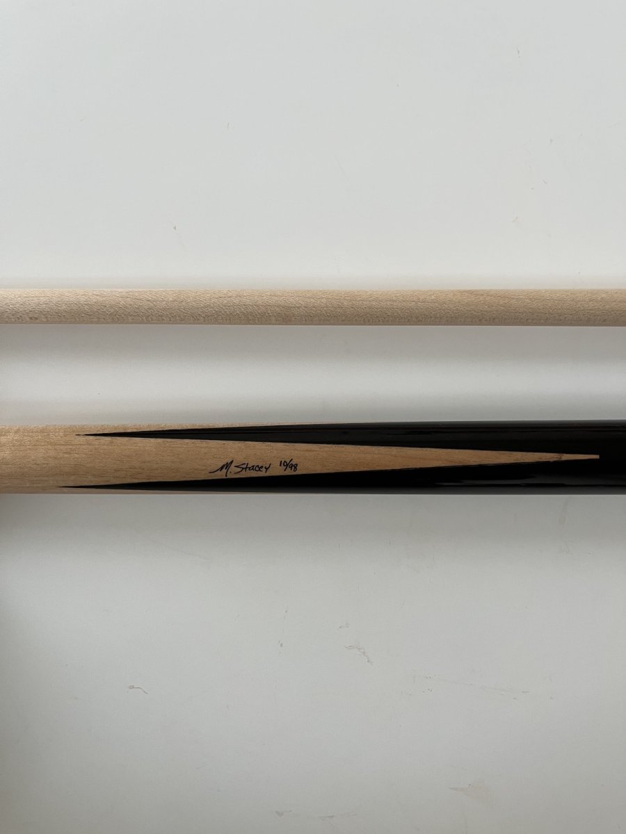 I'm selling this beautiful Mike Stacey cue from 1998. I'm not the original owner, but I'm fairly sure it's a conversion of a silver leaf Dufferin. I believe Dufferin referred to these butterflies as "flames". The forearm and handle are full spliced ebony, and the butt sleeve is also ebony.