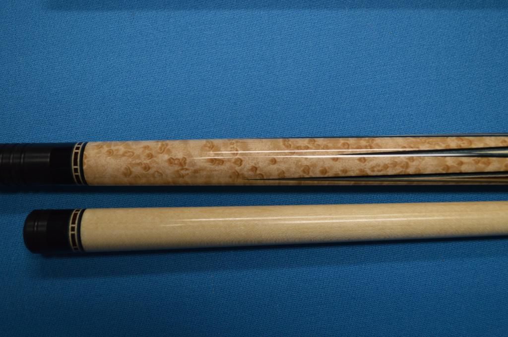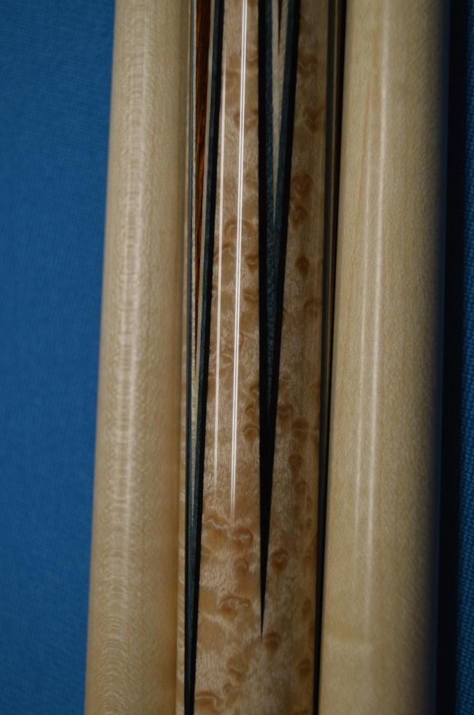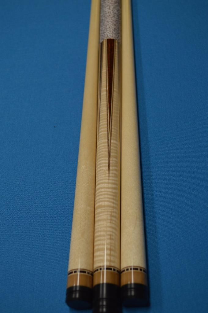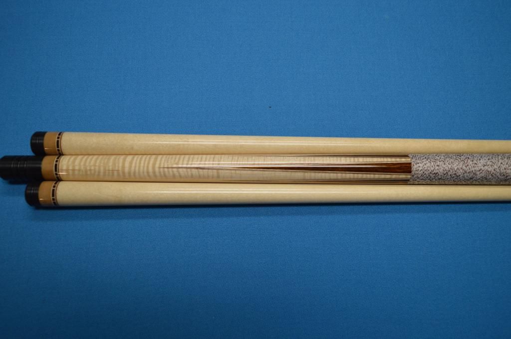 1. Brand new, unchalked, unhit. Cocobolo points, two veneers (white then brown), excellent curly maple nose, brown phenolic, brown specked wrap, 58", 19 oz. Standard Southwest taper, non-ivory ferrules (to make future overseas sales easier), joint protectors. $3995. SOLD I'll keep going until I find the market price for a new Southwest! New info: exact weight: 19.1 or 19.2 ounces: 15.2 ounce butt, 4.0 and 3.9 ounce shafts.
