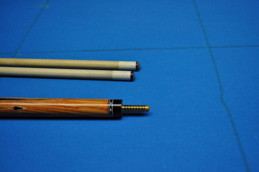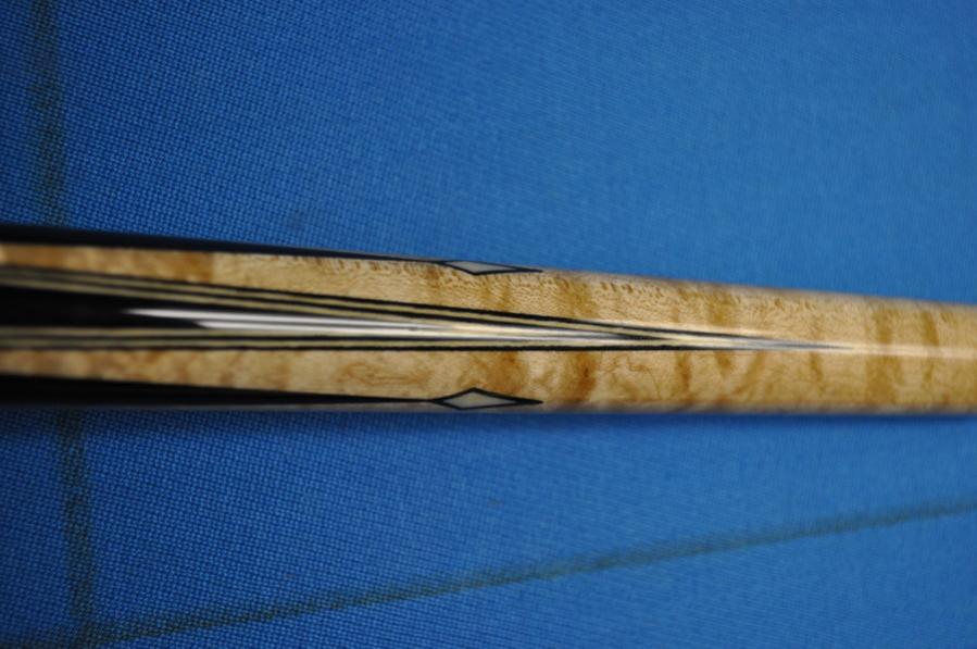 The third cue is a 6 point (3hi 3low) Dan Dishaw ebony into tiger maple with spears on the low points and black, natural, black, natural veneers and large white diamonds on the high points. The buttsleeve is the reverse of the handle. The cue weighs 15.5oz with 2 shafts @ 13mm and 4.0oz and 3.9oz. There are also 2 30" shafts that I can include for $300 extra for 4 shafts total or trade out for the 29" shafts for $50. It has a very small ship in the clear coat on the buttcap.