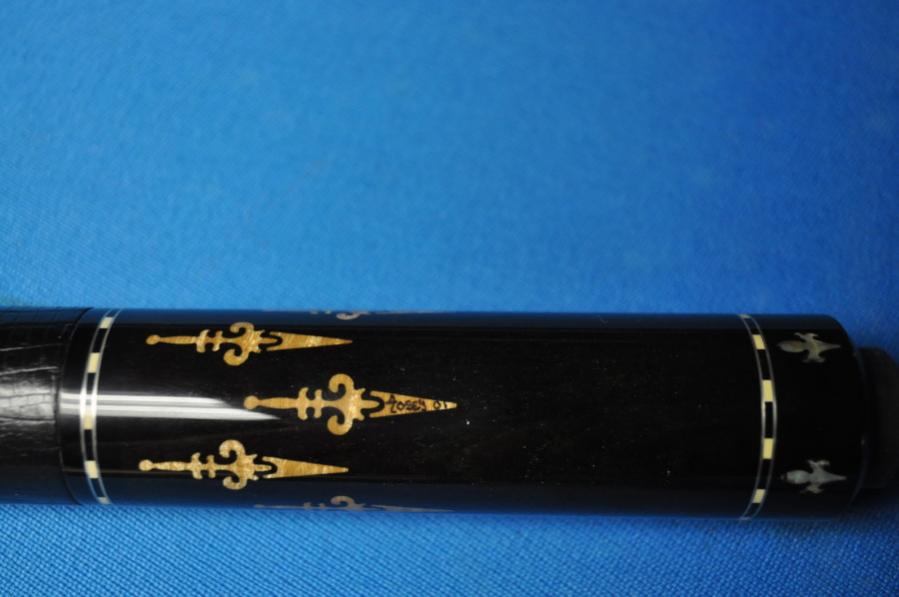 The second cue is a 2001 Josey Ebony jump break. It has a lizard textured wrap and maple spears in the butt sleeve with the abalone Josey fleur-de-les in the butt cap. The cue has black and white dashed ring work. It weighs 15.1oz and has 1 shaft @ 13mm and 3.9oz with a Josey leather jump break tip. 29"/29" http://www.joseycues.com/zoom_popup1.php?item=111