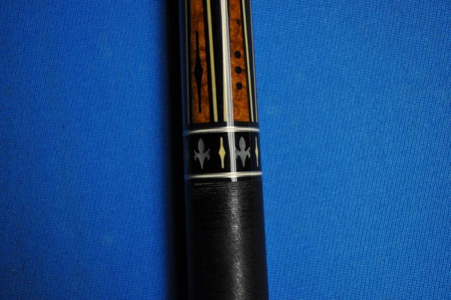 The fourth cue is a Dan Dishaw ebony into highly figured tulipwood with 3hi 3low points with white, black, white veneers and white spears on the low points. The cue has a black and white linen wrap and weighs 15.8oz and has 2 shafts @13mm and both weigh 3.5oz with LBM ferrules. It has white and black dashed ringwork. It has a very small chip in the clear coat on the buttcap,