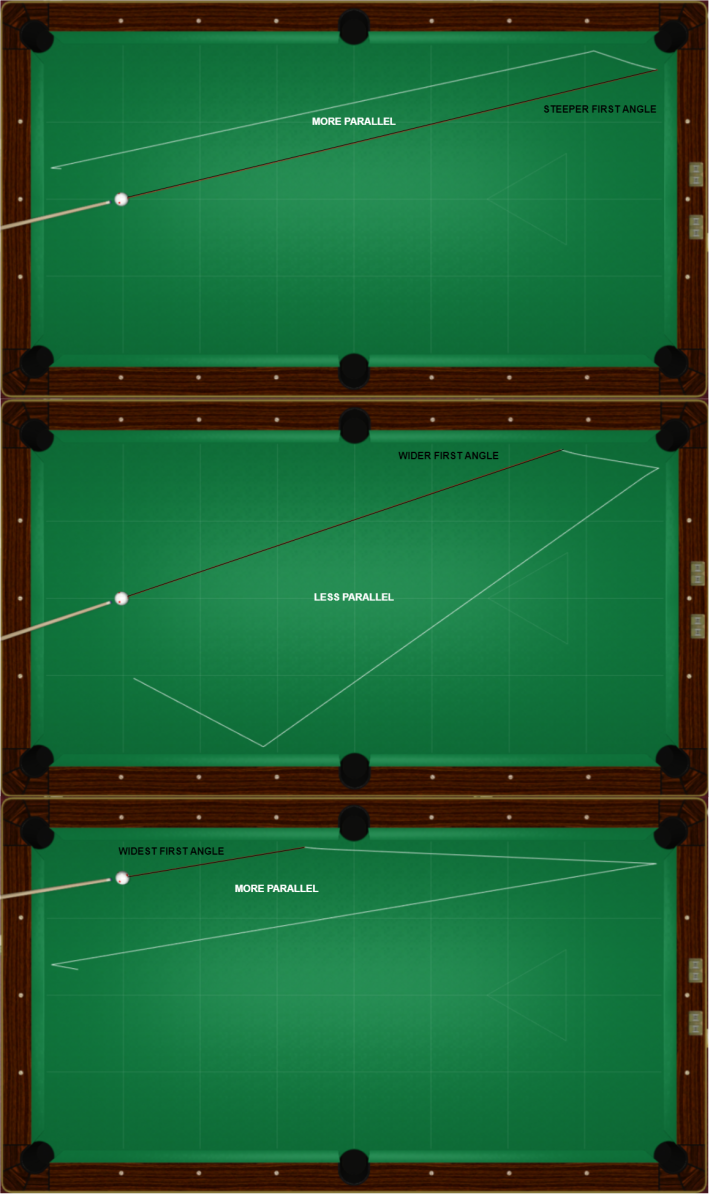2-railers (with no sidespin) that hit the first rail at steepest (most perpendicular) or widest (least perpendicular) angles rebound more parallel to their first leg, and ones that hit the first rail at in-between angles rebound less parallel to the first leg. Most or least perpendicular = more parallel; in-between angles = less parallel.