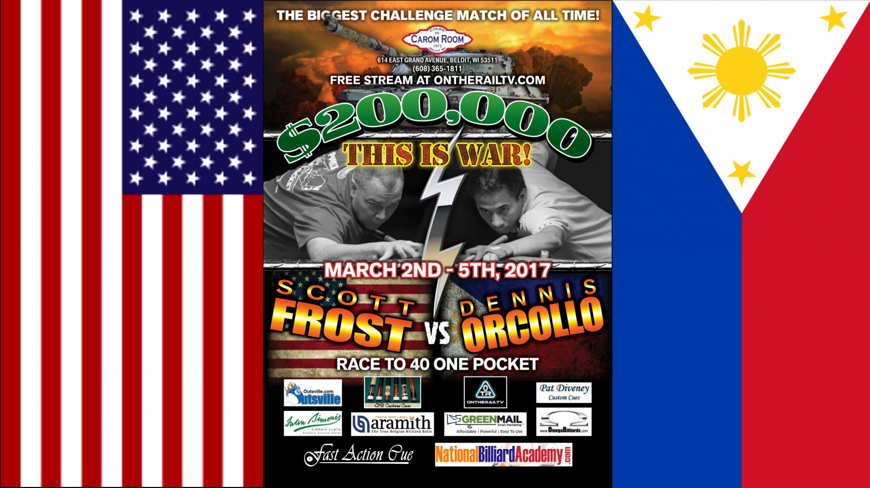 Well this is the match you have been waiting for. Scott Frost vs Dennis Orcollo race to 40 for $200,000 at the Carom Room in Beloit Wisconsin. It will be live and free to watch at www.ontherailtv.com or www.ustream.tv/channel/ontherail . Start time will be 4pm CST for this match. Enjoy! :smile: