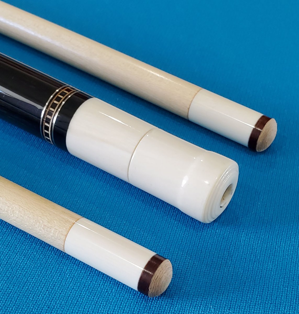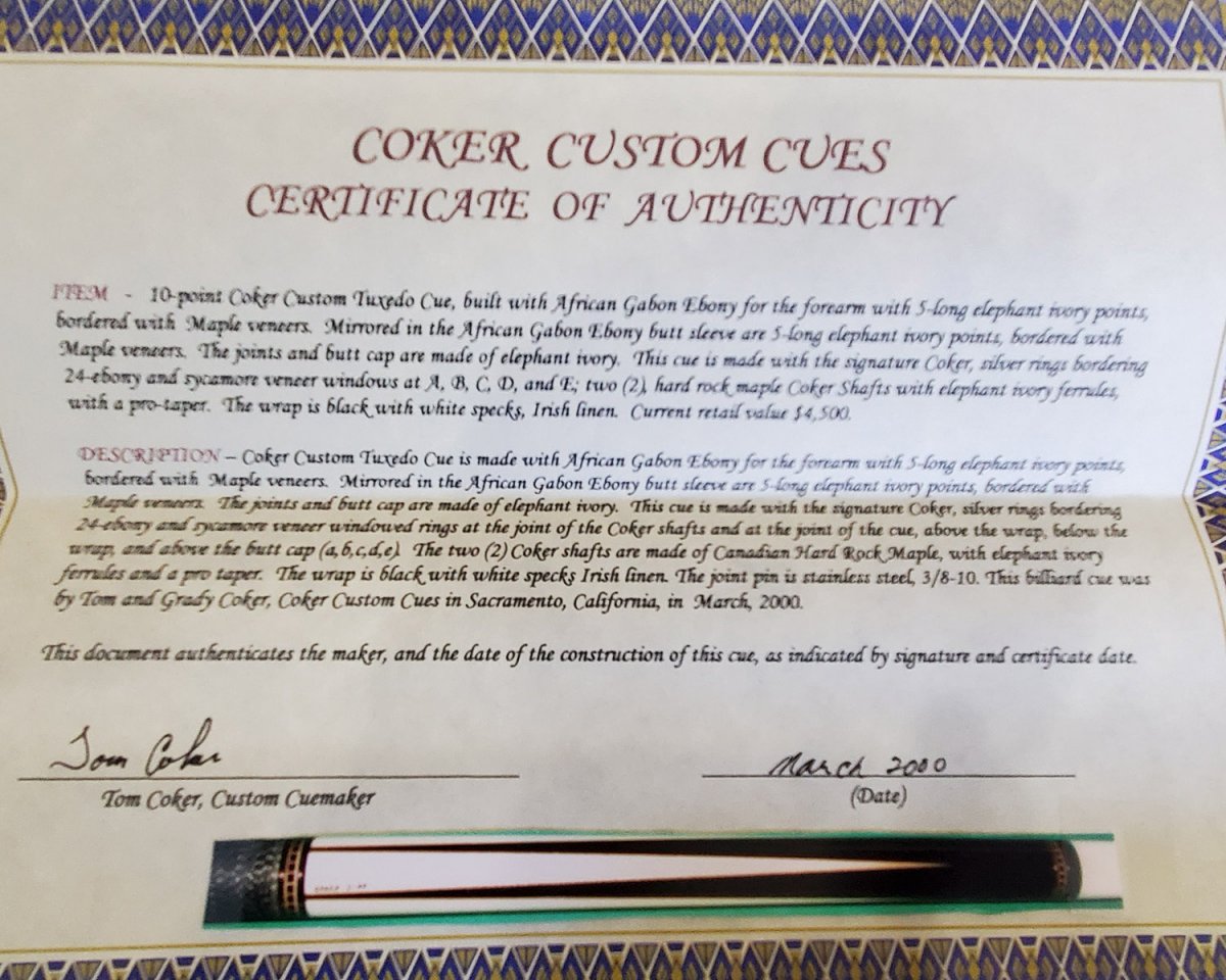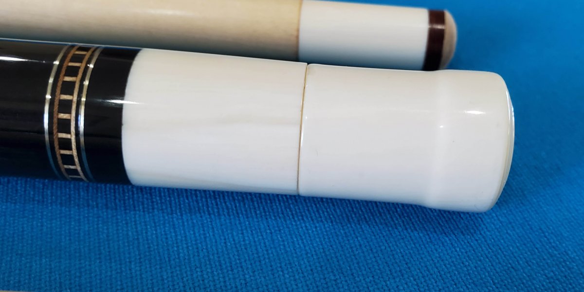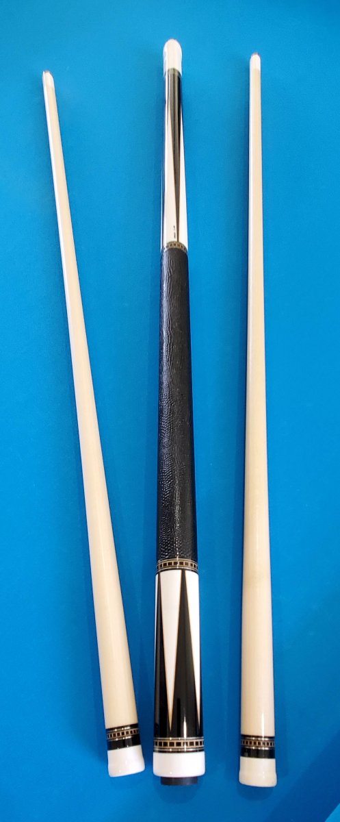 This is a beautiful Tux cue, originally purchased years ago from the "Walton" collection. All IV caps, please look at the IV, it is the best looking I have seen. Rare and most likely not being made any longer. They are all the natural materials including JPs. 100% guarantee, 24hrs to return if not satisfied. perfect condition. you pay return shipping. $4000.00. Never played by myself or when purchased from the Walton Tux Collection