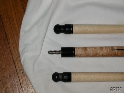 This is a Jerry Olivier cue with 8 ebony floating points (fore & butt), set in birdseye maple, each with white spears and double diamonds inlays. There are nickel silver rings at A, B, C, D & E. The wrap is black Irish linen with gray specks. This cue comes with two shafts; one played, the other is new. The wood to wood joint makes for a great hit.