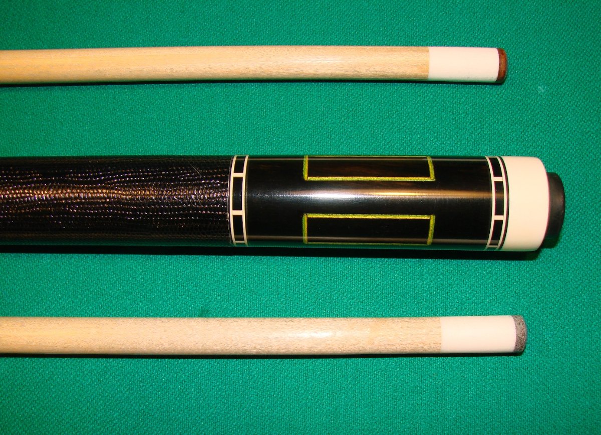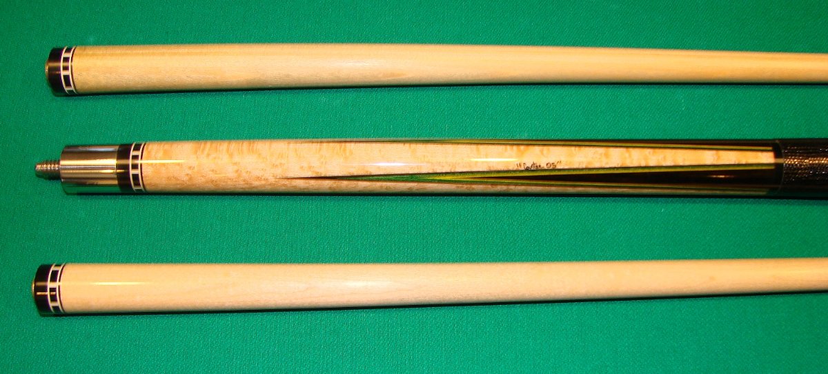 Chad Carter “2005” 4 point ebony into maple with 4 veneers, leather wrap, veneered boxes in butt, and matching rings in butt and at the joint. Butt weighs 15.48 ounces. Joint is 5/16”x14 piloted. Shaft 1 is standard maple, 12.80 mm, and 3.70 ounces. Shaft 2 is laminated maple, 12.65 mm, and 4.16 ounces. Cue is 58 inches long even split. Cue is in very nice used condition with some small dings in the butt.