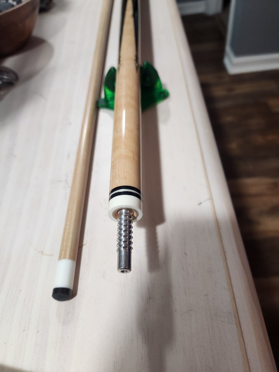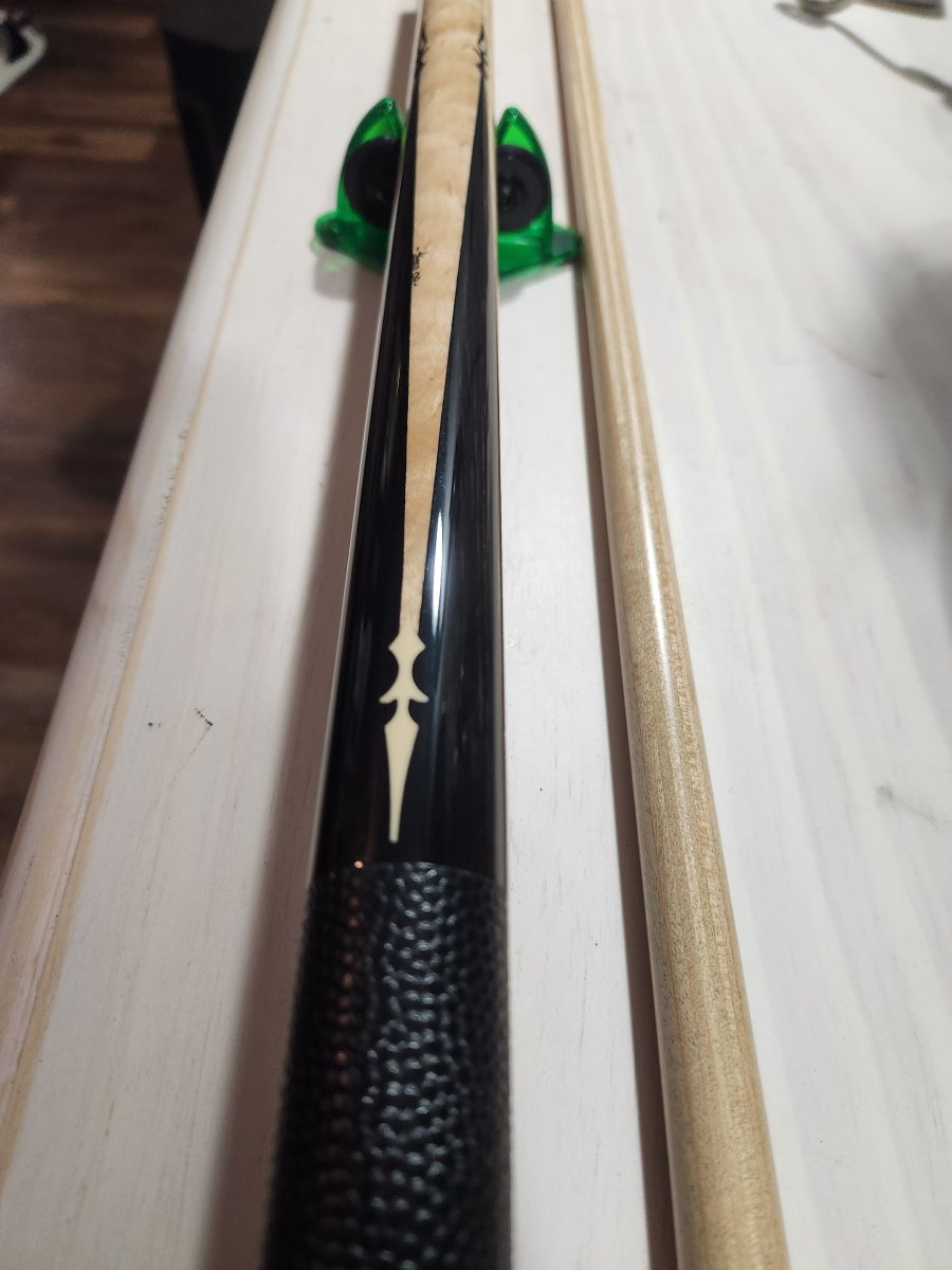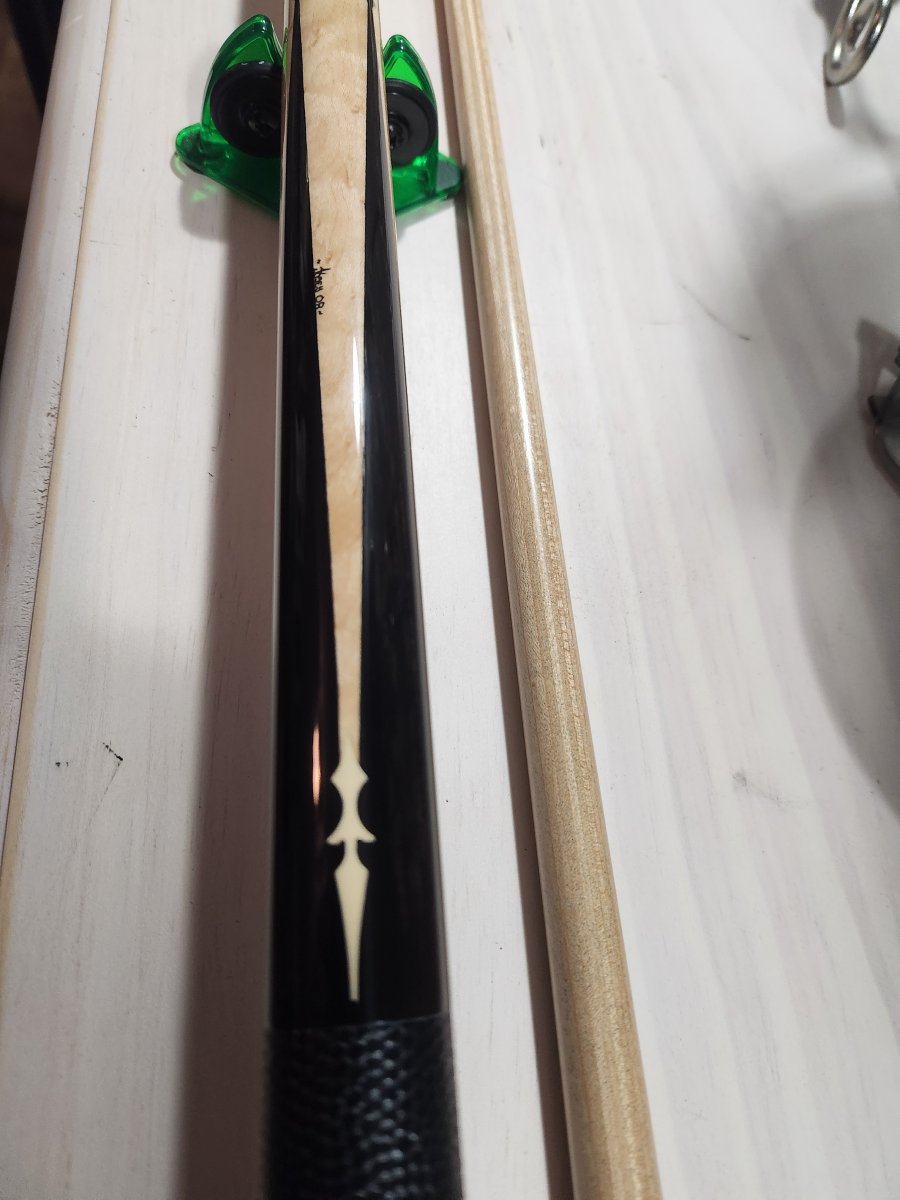 Up for sale is a 2008 Keith Josey. Full splice birdseye into ebony. Inlays at the tips and base of the points. Buttsleeve as well. Leather wrap, radial pin. Weights available upon request. Josey "Zero" laminated shaft at 13mm with new Kamui black medium tip. Everything straight together and apart. No trades. $1300 plus shipping.