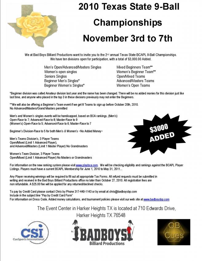 Hey Texas it's that time of year again.. We have the 2010 Texas State BCAPL 9-Ball Championships coming up in November.. The entry forms and Flyer information is up on our web site @ http://www.badboysbp.com