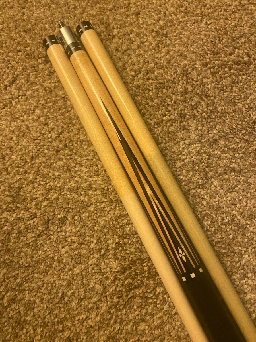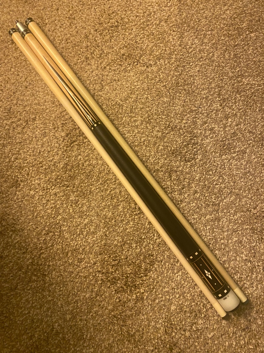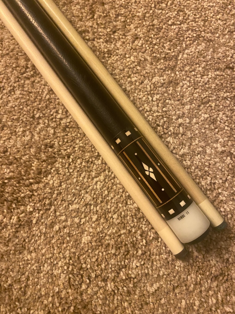 The cue has a few minor dings, great condition for its age. The but weighs 15.8oz, the played shaft weighs 4.0oz and the light played shaft weighs 3.9oz. Smooth leather wrap. Dead straight together and apart. No trade offers please. $2900 Rod 425-287-3884