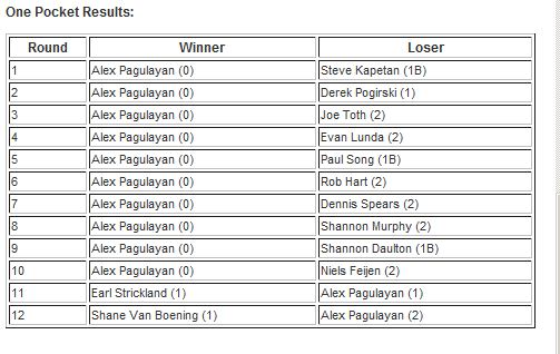 This is the semi-final match at the Derby City Classic Onepocket, between Shane Van Boening and Alex Pagulayan. Filmed on Jan 27th at 7:00 pm. There was Shannon Daulton, Earl Strickland, Alex and Shane, and Scott Frost, left in the tournament in the previous round. Alex lost to Earl, Shannon had a bye, and Shane beat Scott. This left Shannon playing Earl on the TV Table and Alex and Shane battling it out to see who gets in the Finals.