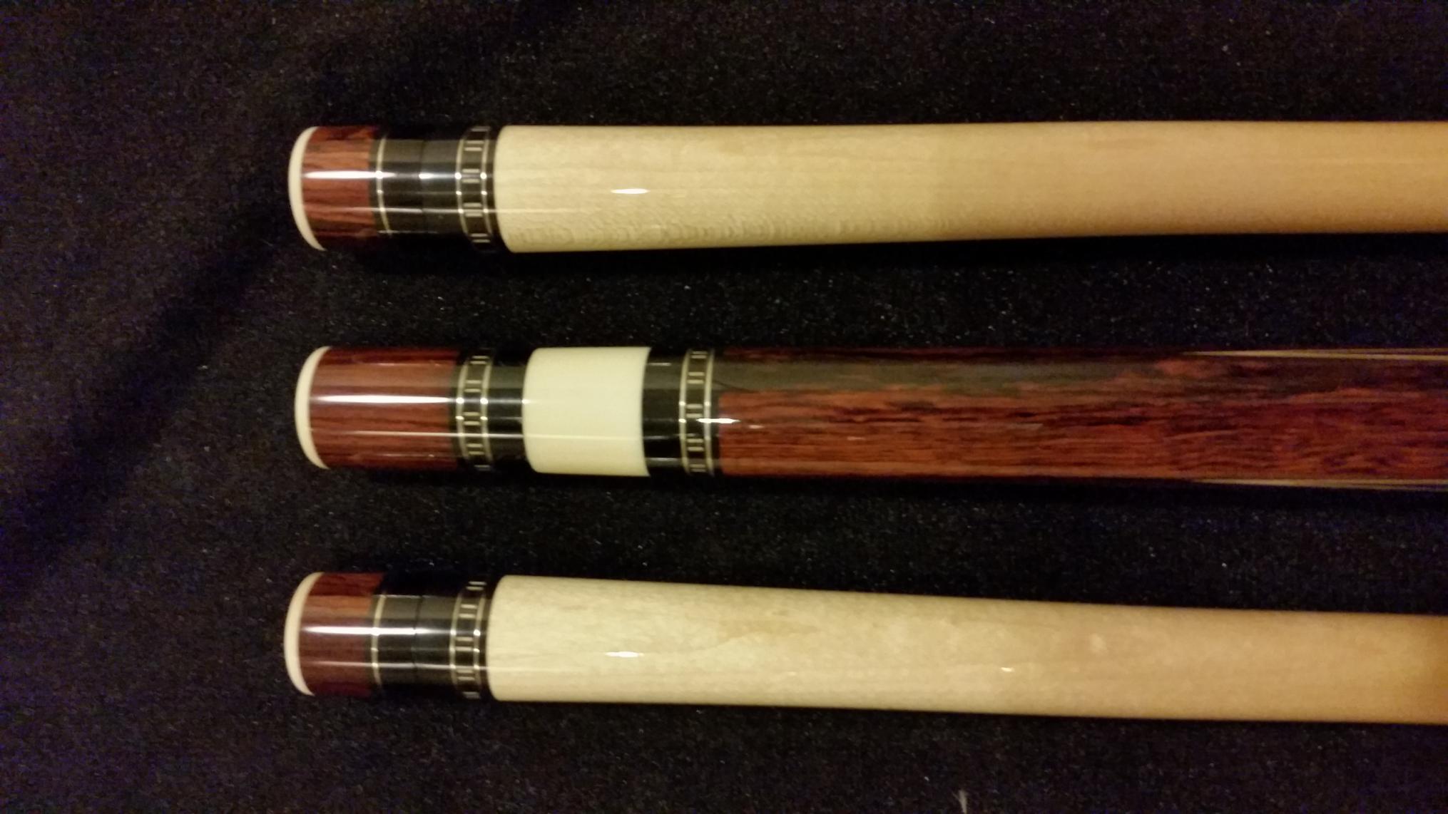 Massive Josh Treadway... 6 point 3 high 3 low into Camatillo Rosewood.. Black leatger wrap... Custom caps. Bl, wh, bl, wh, bl veneers. 13 mm shafts Ivory ferrules. Ebony and silver blocked rings,