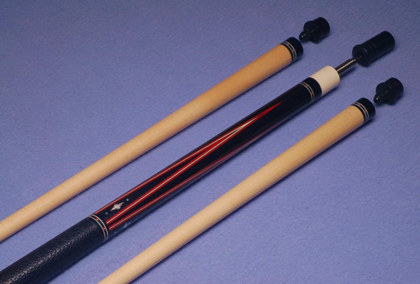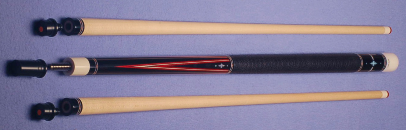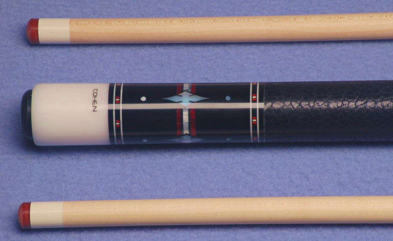 Cohen SBE20a. Brand new 2020 Eddie Cohen Gaboon ebony into Gaboon ebony 4 point 5 veneer (red, black, white, black, red) cue. Slotted radial MOP diamond and dot inlays in points and buttsleeve with additional white and red pearlescent bands. Tomahawk joint sleeve. Delrin buttcap. Veneer dash deco ringsets at all positions. Black wild scotch grain leather wrap. 3/8-10 pin, flat-face joint. 2 shafts 13mm (3.88/ 3.89 oz.) with 5/8" Tomahawk ferrules and Triangle tips. Cue weighs 19.09/ 19.10 oz. with 19-1/4" balance. Delrin joint protector set included. SOLD. Super sharp one off cue. No trades or other offers. TY.