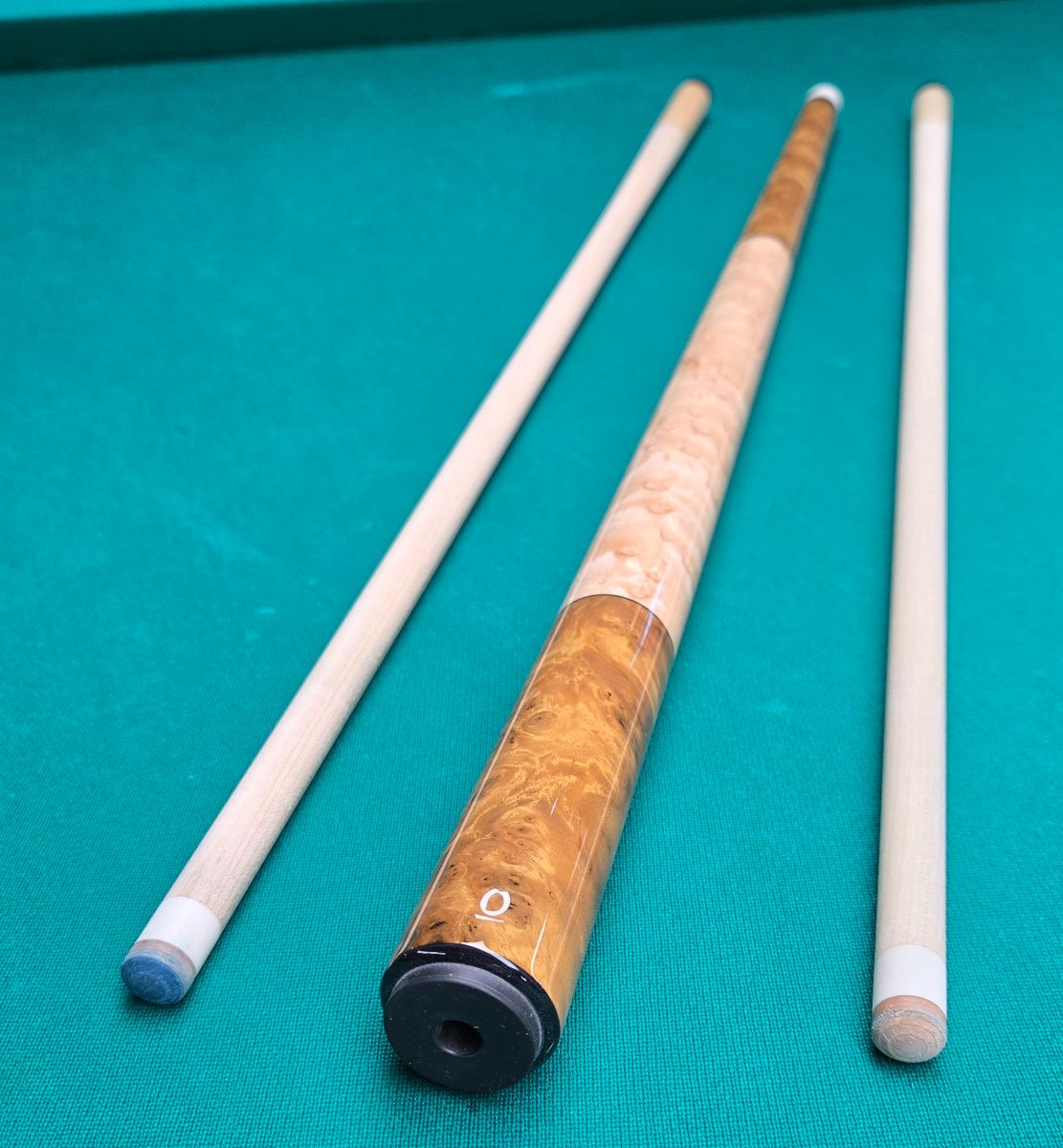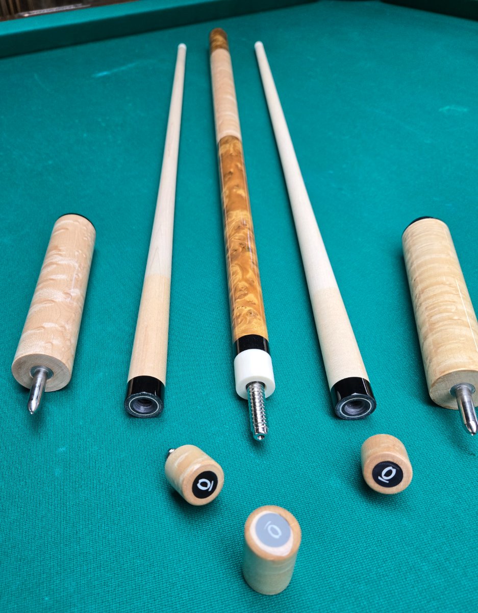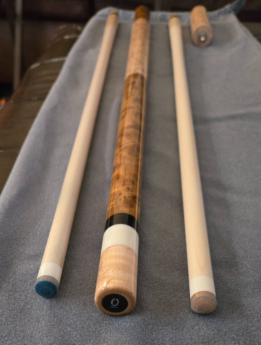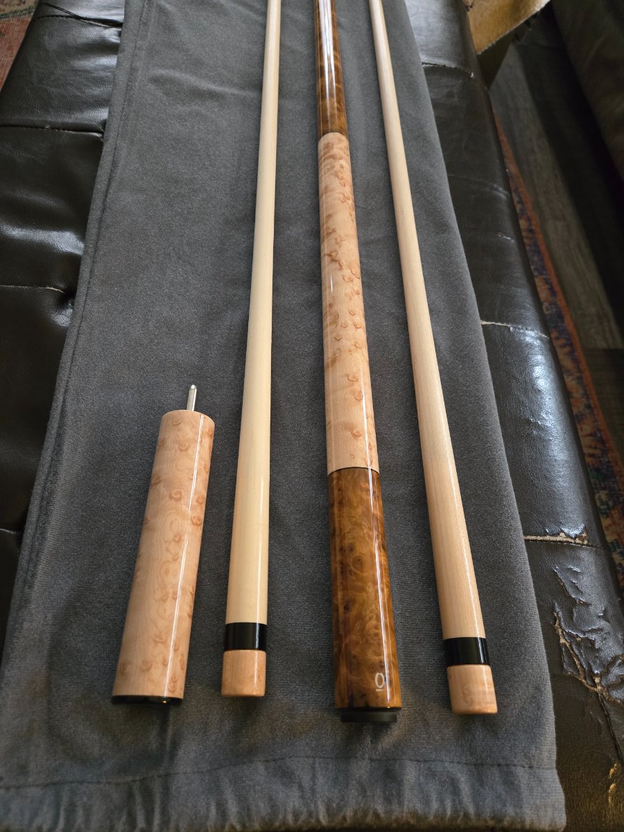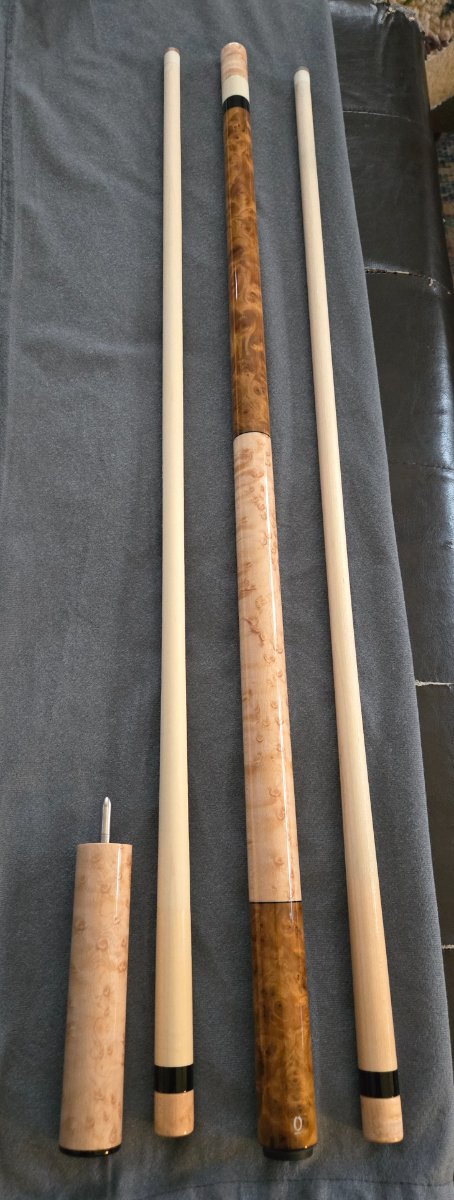 2023 Arthur Queue Camphor Burl MW with Birdseye handle. Ebony rings and butt plate. Supertusk Joint. 3/8-10 Mod. Pin. Shaft #1 was chalked and lightly played. Shaft #2 is unchalked/unplayed. Both shafts, butt, and extension are laser straight, together and apart. No scratches, dents, or finish anomalies. This cue is in mint/collectable condition. It also hits and plays phenomenal.