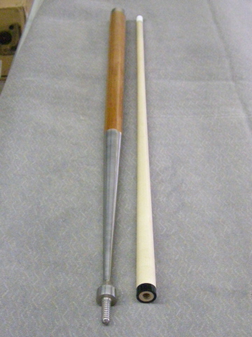 i made this cue for s's and g's. the forearm is one piece of solid ss 13 inches long, the buttcap is also ss. i used koa the lightest wood i could find in the shop for the back piece of the cue and it still weights 32 oz. what a joke. i thought i was really going to smash those balls but there is no way i can get it moving fast enough to generate any power.