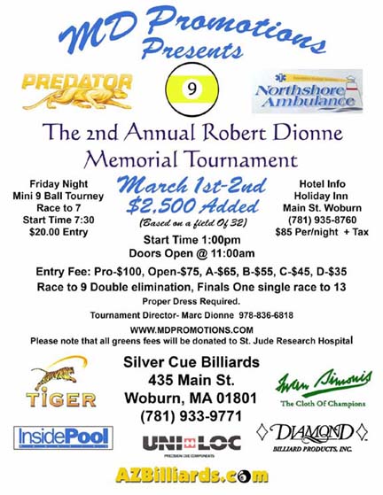 This event is March 1st -2nd with $2,500 Added at Silver Cue Billiards in Woburn, Ma check out flyer Go to www.mdpromotions.com for more information