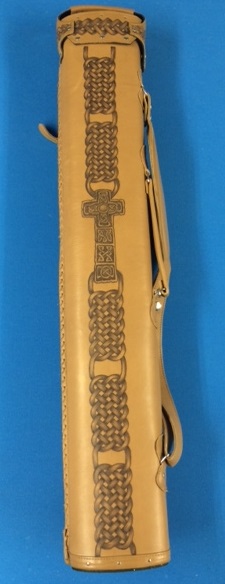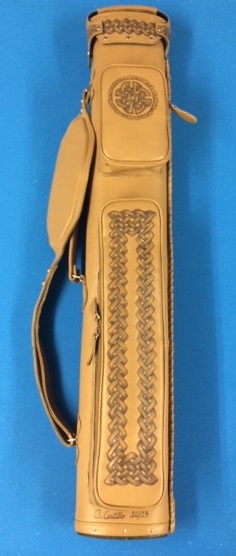 2X4 Flip Lid Cue Case made of Saddle Tan Pebbled Leather adorned with Celtic Artwork pyrographed by hand on front and back.