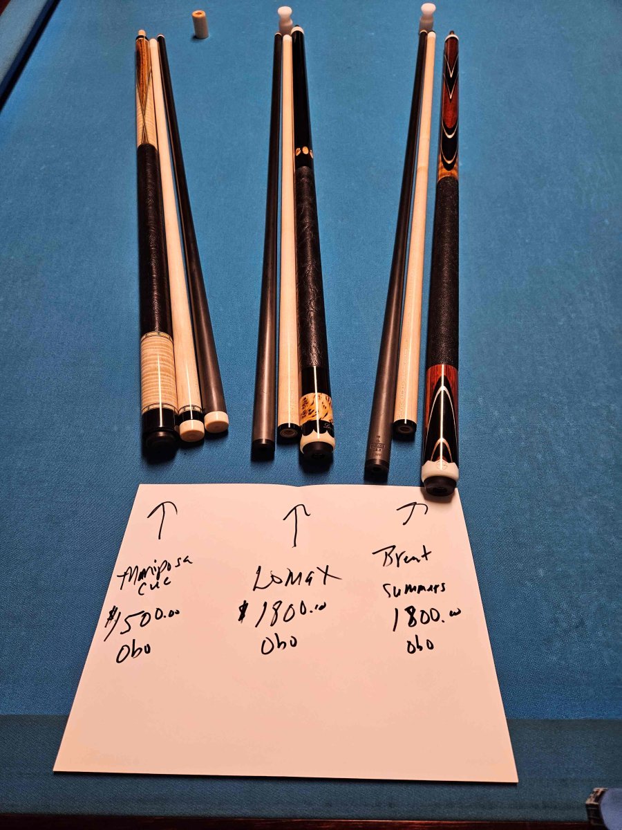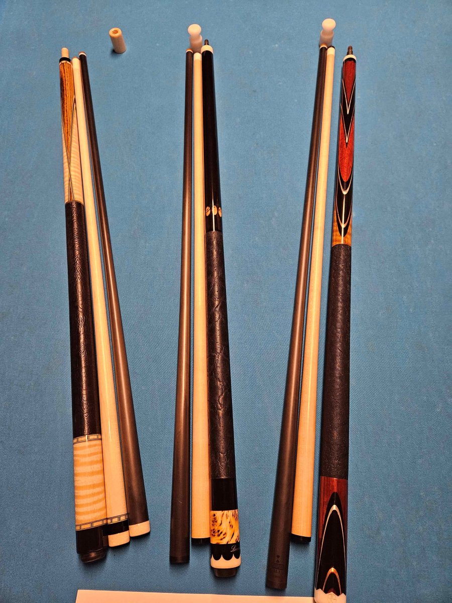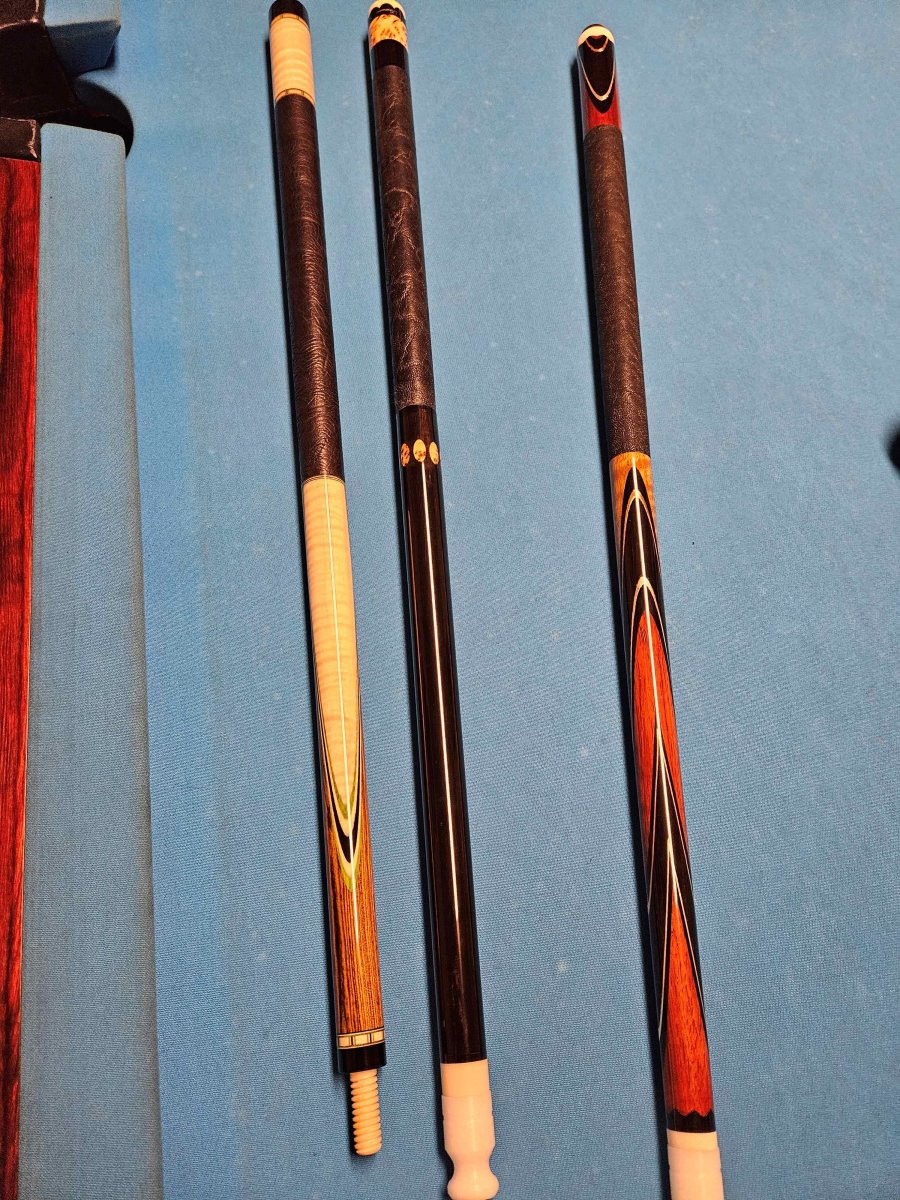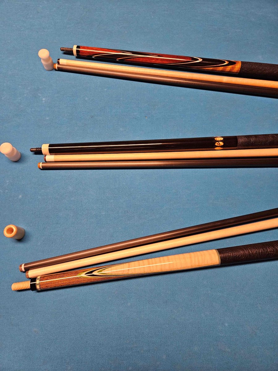 Brand new test hit Bocote and Curley cue, butt is 14.30 (adjustable) Shafts are 29 inch, the wood shaft is 3.85 and the carbon fiber shaft is 4.10