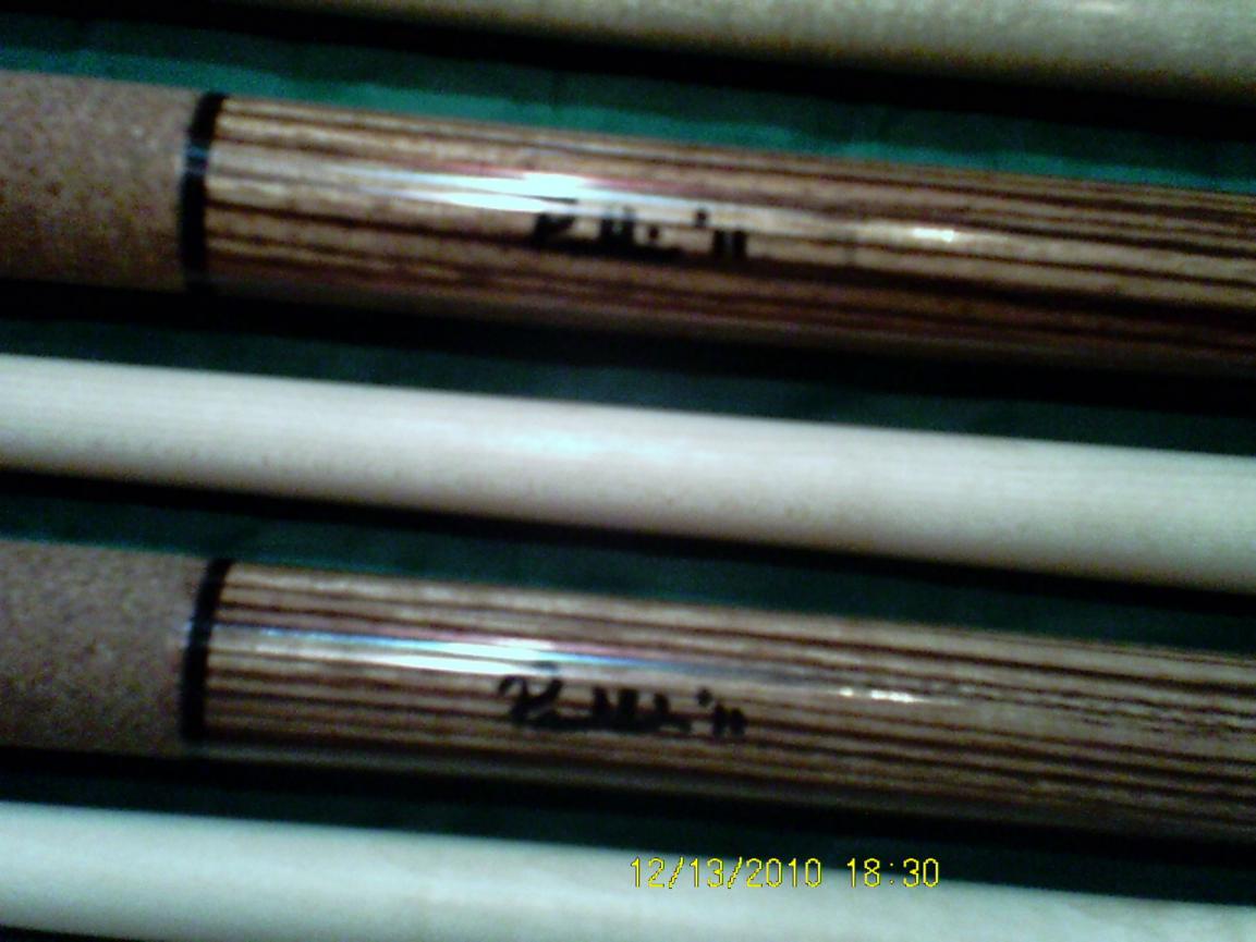 Cue 2: Pruelhire 19.5oz zebra wood cue /w cork wrap. Cue has 1 shaft with hard tip. /w matching joint protector. cue is signed and dated