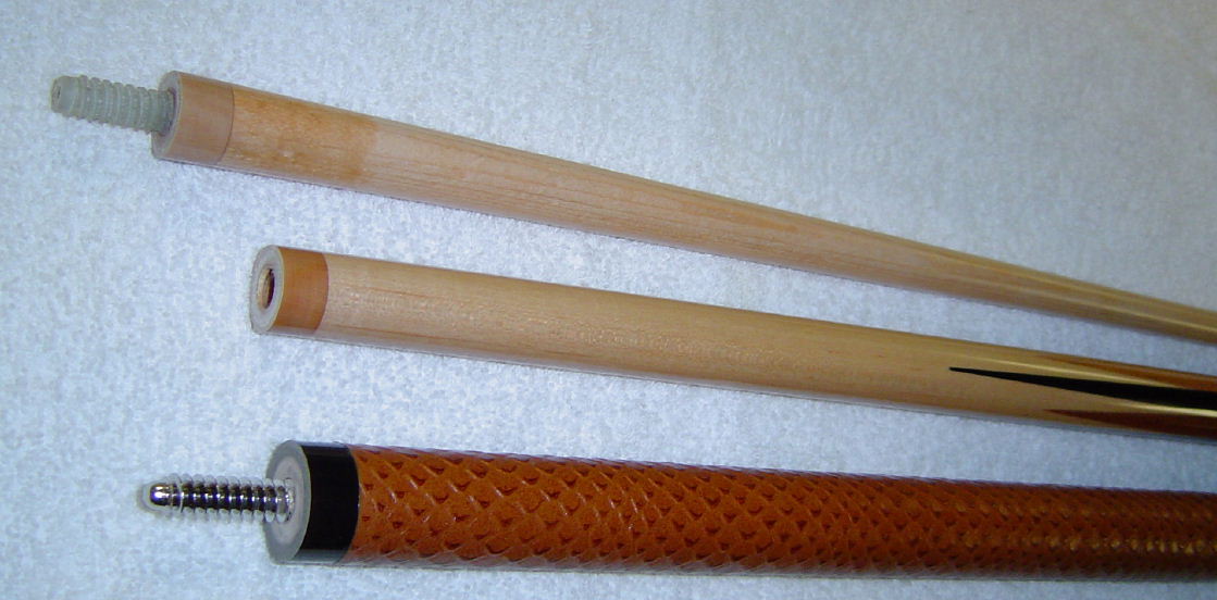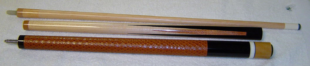 The handle is straight grained maple with ebony butt sleeve,hopie ring and natural linen butt cap.A brown leather wrap looks like snake skin.The center section is from a dufferin house cue.I added 4 more ebony pionts to make a pionter.The shaft is a laminated maple 22 inches long with a 3/8 g-10 pin.