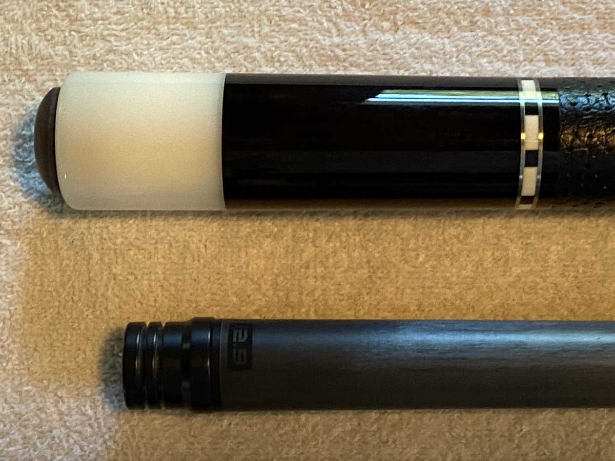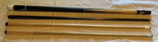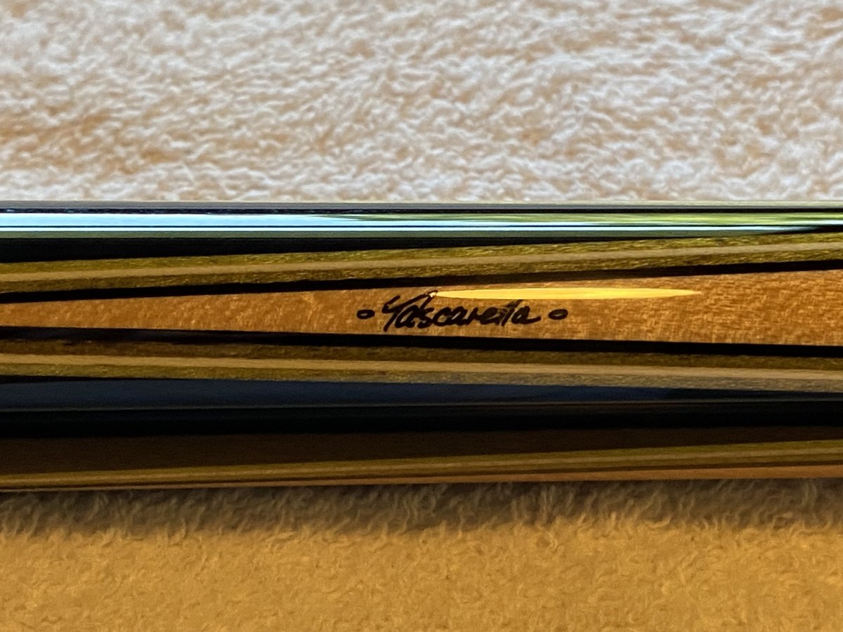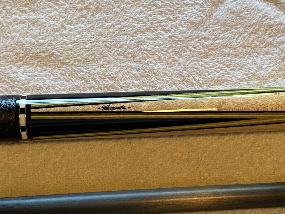 For sale is a four point Tascarella made by Pete Sr. in the 1980s. The veneer colors are olive. It has a stainless steel joint with a 5/16x14 pin, birdseye maple forearm, gaboon ebony points, two ivory and nickel silver bushka rings above and below the wrap, and a black boars hide wrap. Tascarella logo was hand done during the time it was made. It comes with one new / like new Tascarella shaft (4.0 oz.) (12.3mm), one Predator Revo 12.9 shaft (4.5 oz.), and one older, used Predator 314-2 shaft (4.05 oz.). Cue butt weighs 17.25 oz. Measures 59" with shaft attached. Personal reasons force sale or I would not let this go. SOLD pending payment. NO TRADES. Please message me with any questions.