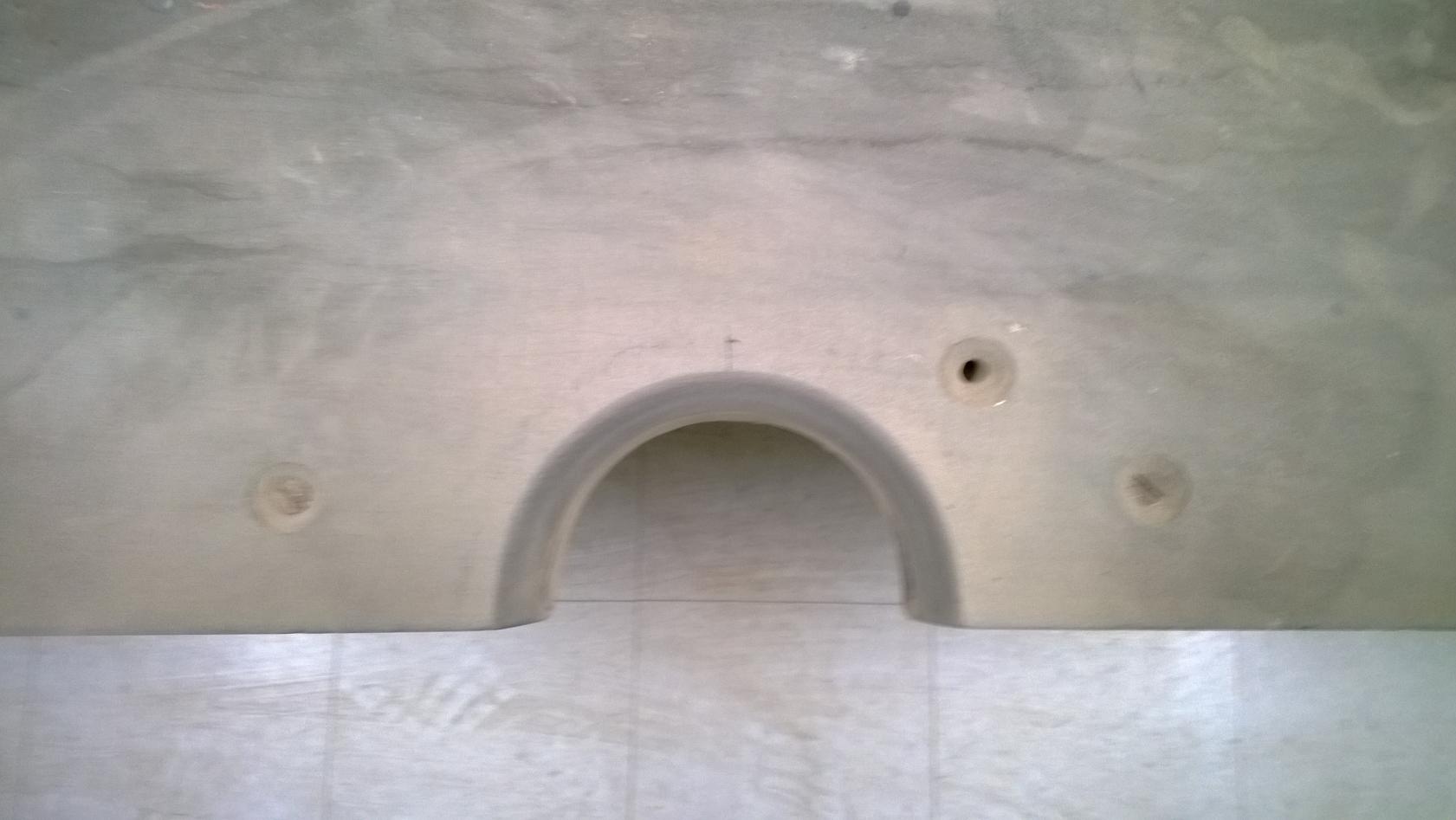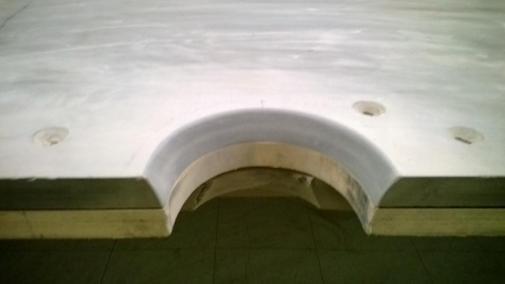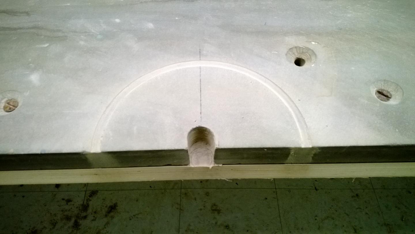 The next biggest chore was cutting the pockets into the slate. I created jigs, using a diamond bit in a trim router, to layout the pockets. This gave me a nice sharp line to cut to. The corner pockets were fairly easy to cut, as the slate is cut at a 45 degree angle, and has a beveled wood block attached at the end. For the side pockets, I used a hole saw to cut the wood backer boards, and cut the slate along my layout lines with a diamond blade in a jigsaw. To finish off the pockets, I used a belt sander, and put a radius on the pocket edges with a diamond sanding pad.