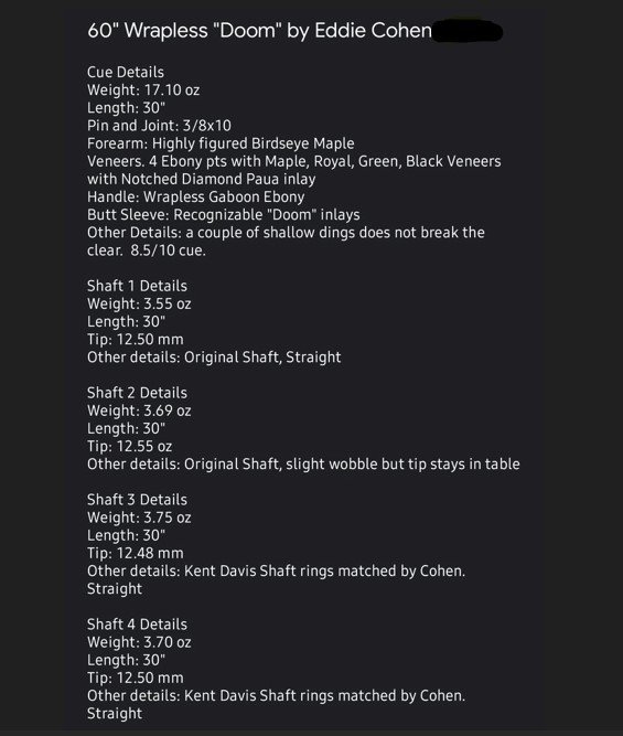 Color of Money "DOOM" tribute cue. 3/8 10 pin, 4 shafts 2 by Cohen, 2 by Kent Davis. See pics for weights and specs on cue and shaft.