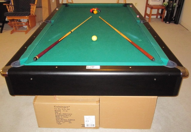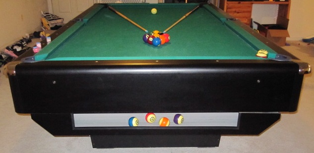 For sale is an 8' AMF Playmaster Black Magnum pool table with 3-piece 1" slates, ball return, and Simonis 860 Green Cloth. The pockets are tighter than normal where 2 balls will not fit together inside the pockets. This table is solid as a rock and the balls on the table will not move even if you bump into it. This comes from a smoke-free home. It's an elegant and stylish black table that will fit nicely into a contemporary decor. It comes with a set of balls and 2 cue sticks.