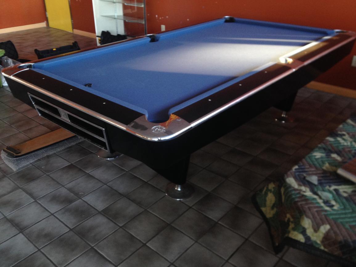 I have an 8-foot Gold Crown 4, Black with Nickel Trim. Good condition.Just got this table and is being sent out to the paint shop. I haven't done any rail work yet so you get your pick of cushions and pocket size. Starting at $3500 includes Simonis, Local delivery and new drop pockets.