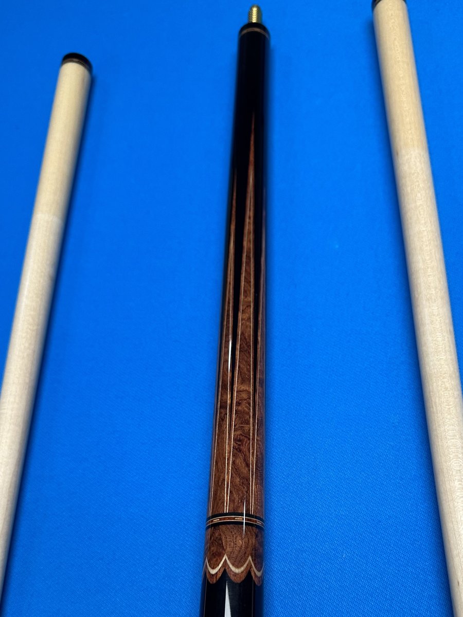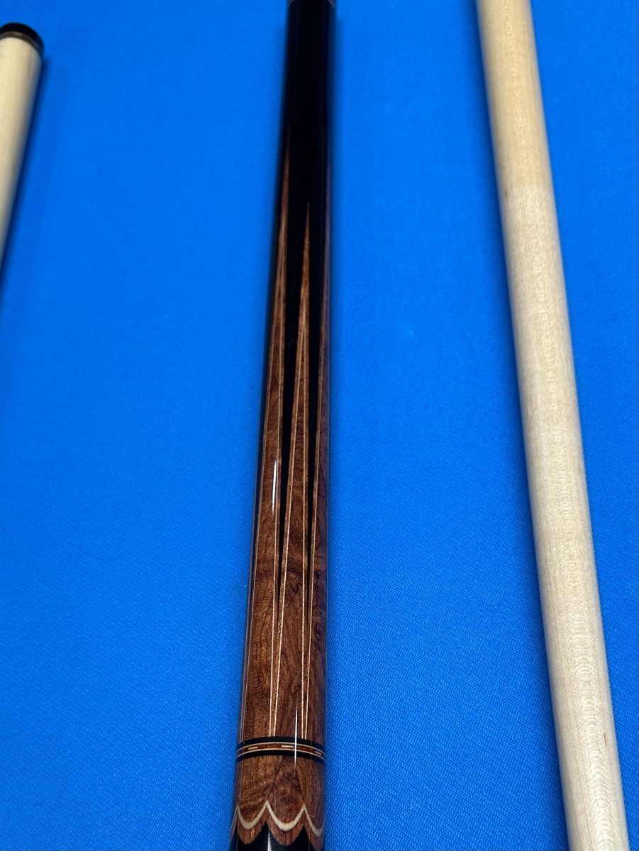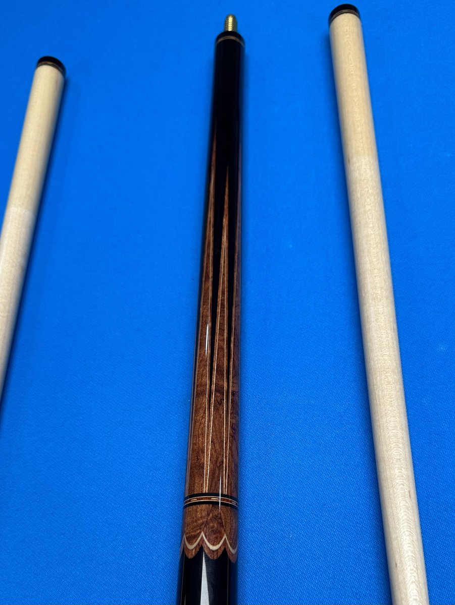 New 8 point Eric Crisp Sugartree w/2 shafts ebony and waterfall bubinga w/scallops .Shafts are 29" and 4.2 oz. 13.15 mm.Butt is 14.9 oz and 29" .Cue has 3/8-10 pin .This is really a beautiful cue and only one he ever made with waterfall and Ebony.$3950 shipped in United States